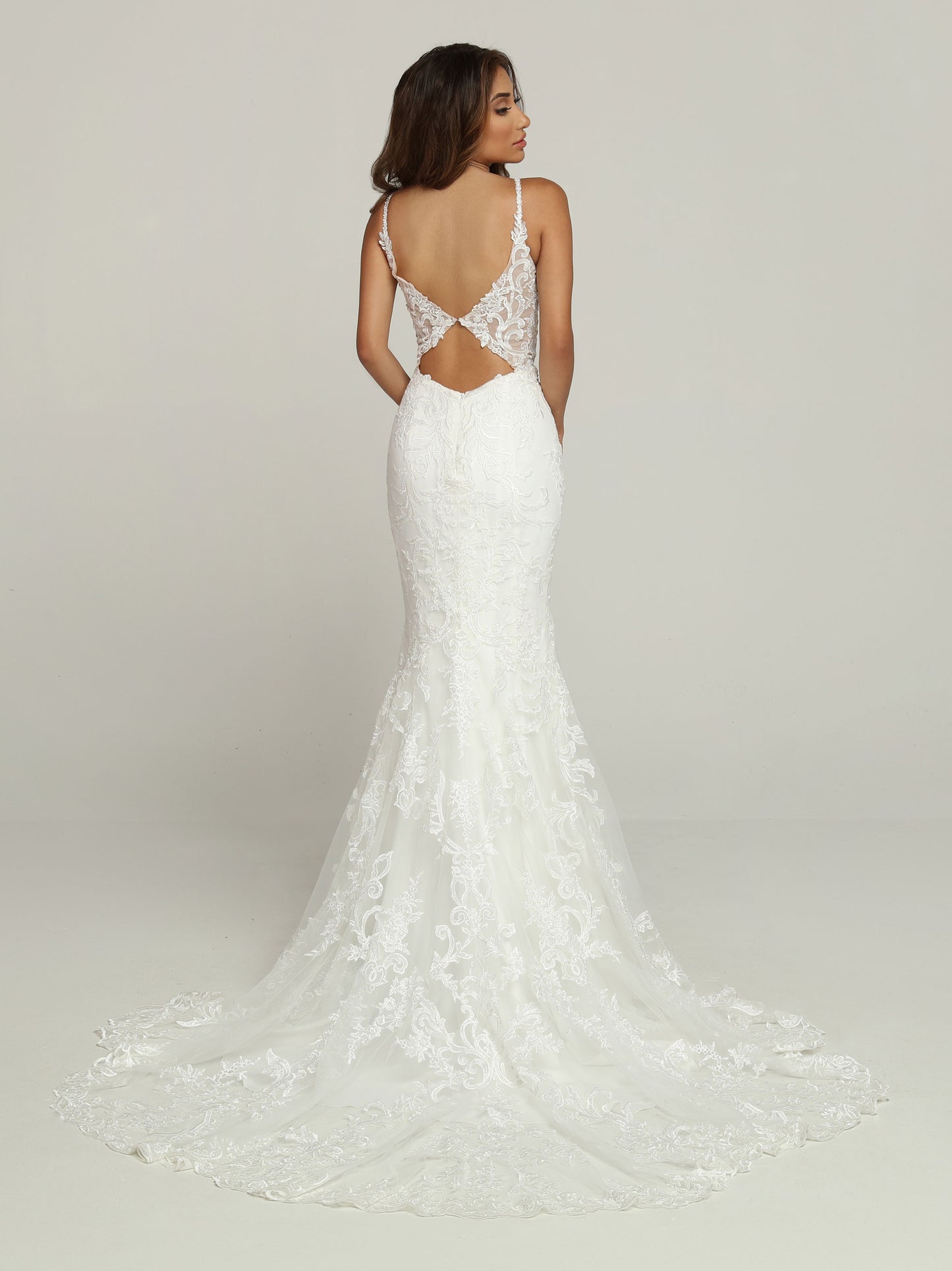 Davinci Bridal 50700 Long Sheer Lace V Neck Wedding Dress Flare Bridal Gown Cutout Back A Peek-a-Boo Back makes this Lace Sheath Fit & Flare Wedding Dress truly Runway Worthy. The Sheer Lace Bodice has a Plunging V-Neckline & Narrow Shoulder Straps. Triangle Shaped Bodice Sides connect to create a Double Keyhole over an Open Back. The Form-Fitting Fit & Flare Skirt ends in a Chapel Train.