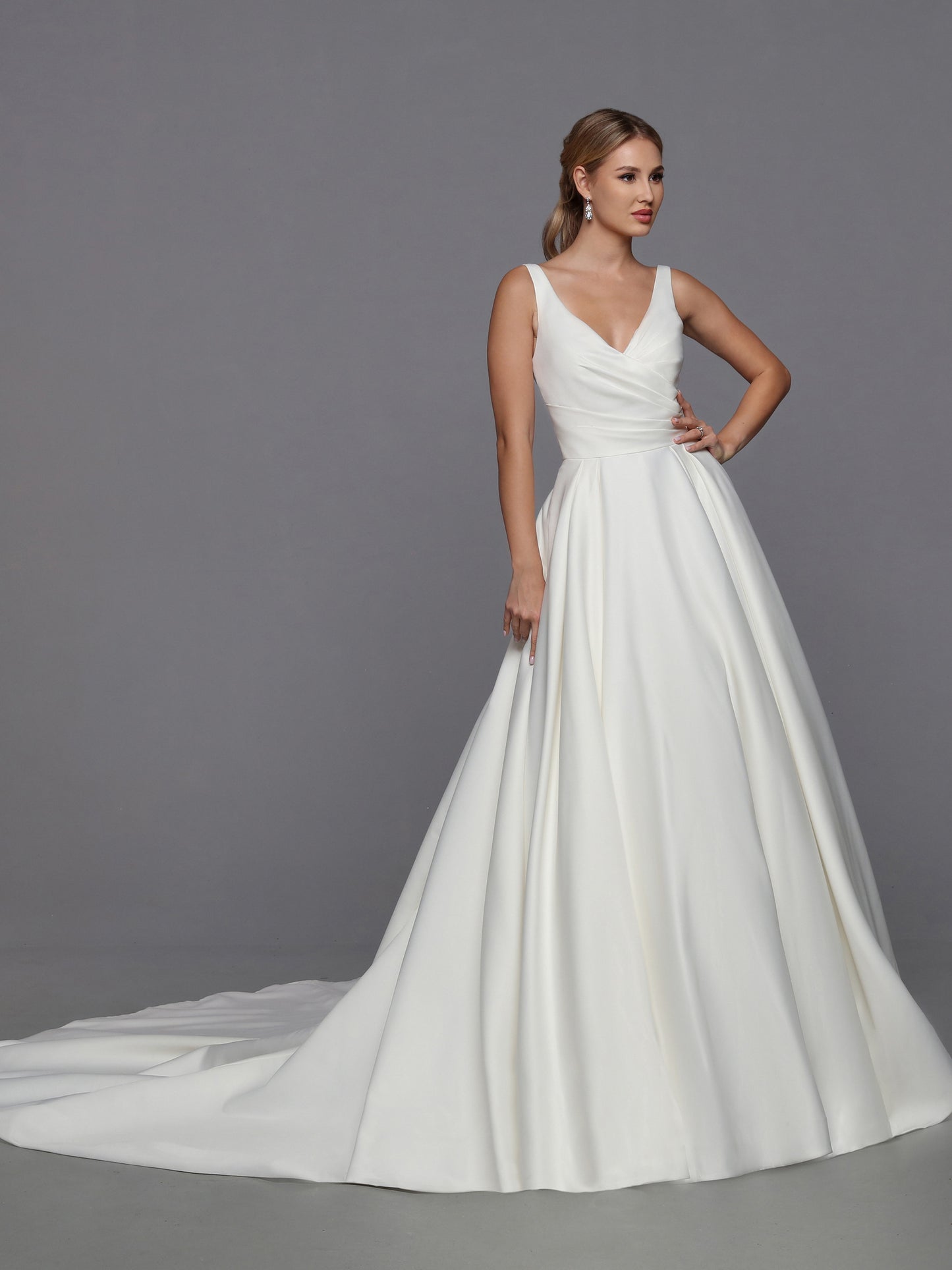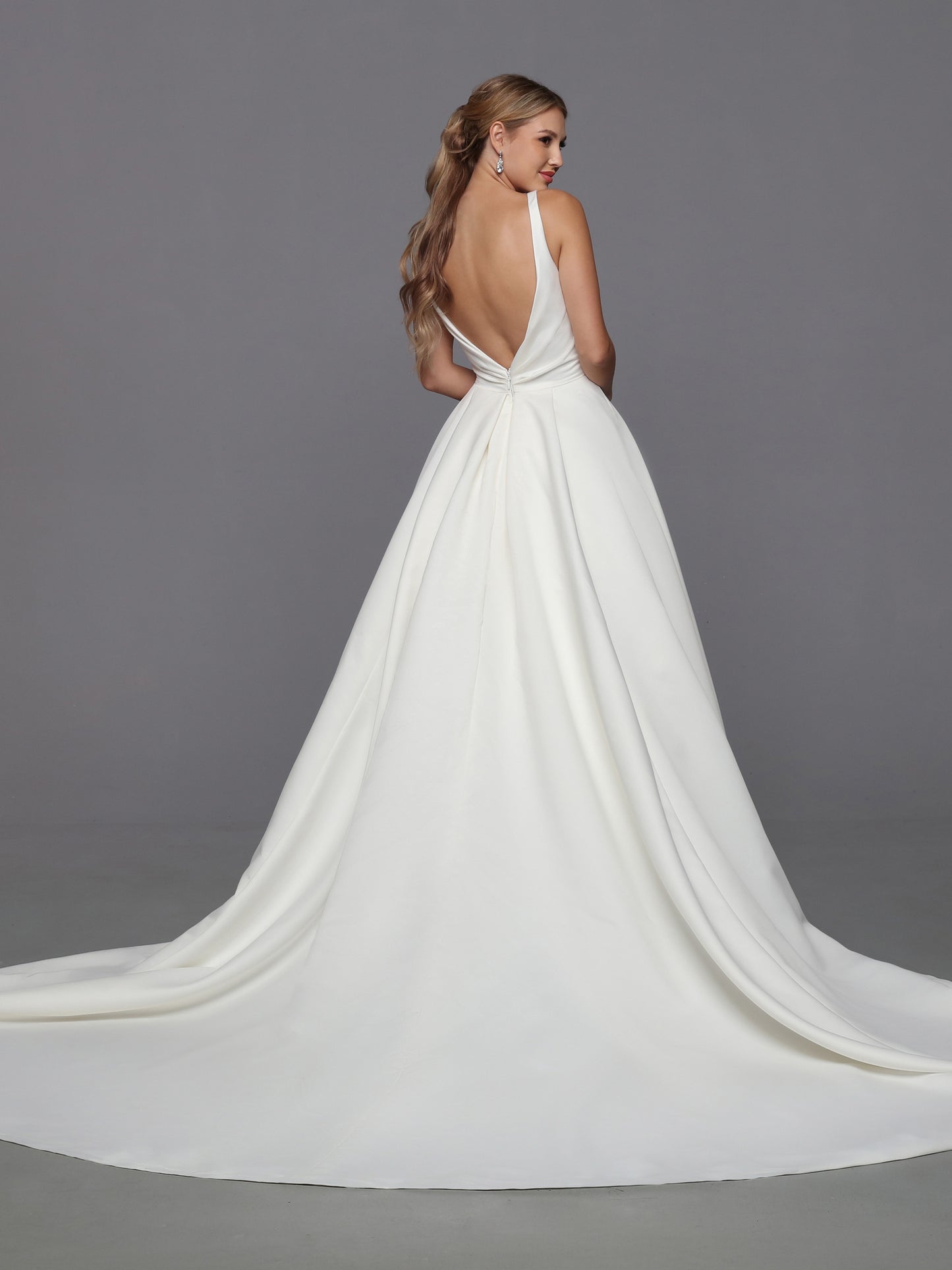 DaVinci Bridal 50766 A-Line Ballgown Satin Open Back Pockets Bow Train Wedding Gown. This feminine satin ball gown features lovely on-trend updates. The faux-wrap bodice has a waist-deep V-back accented with a removable oversized bow.