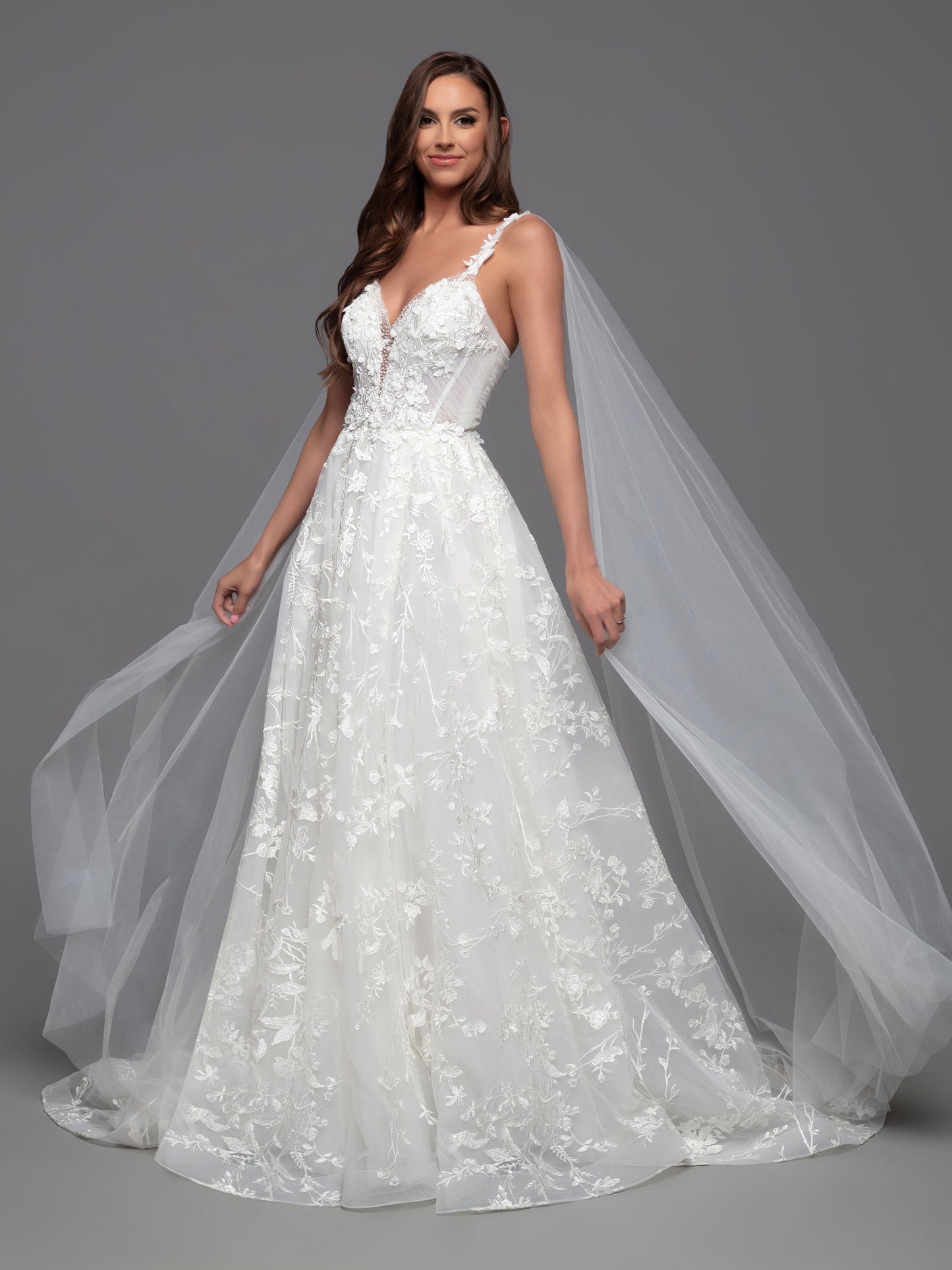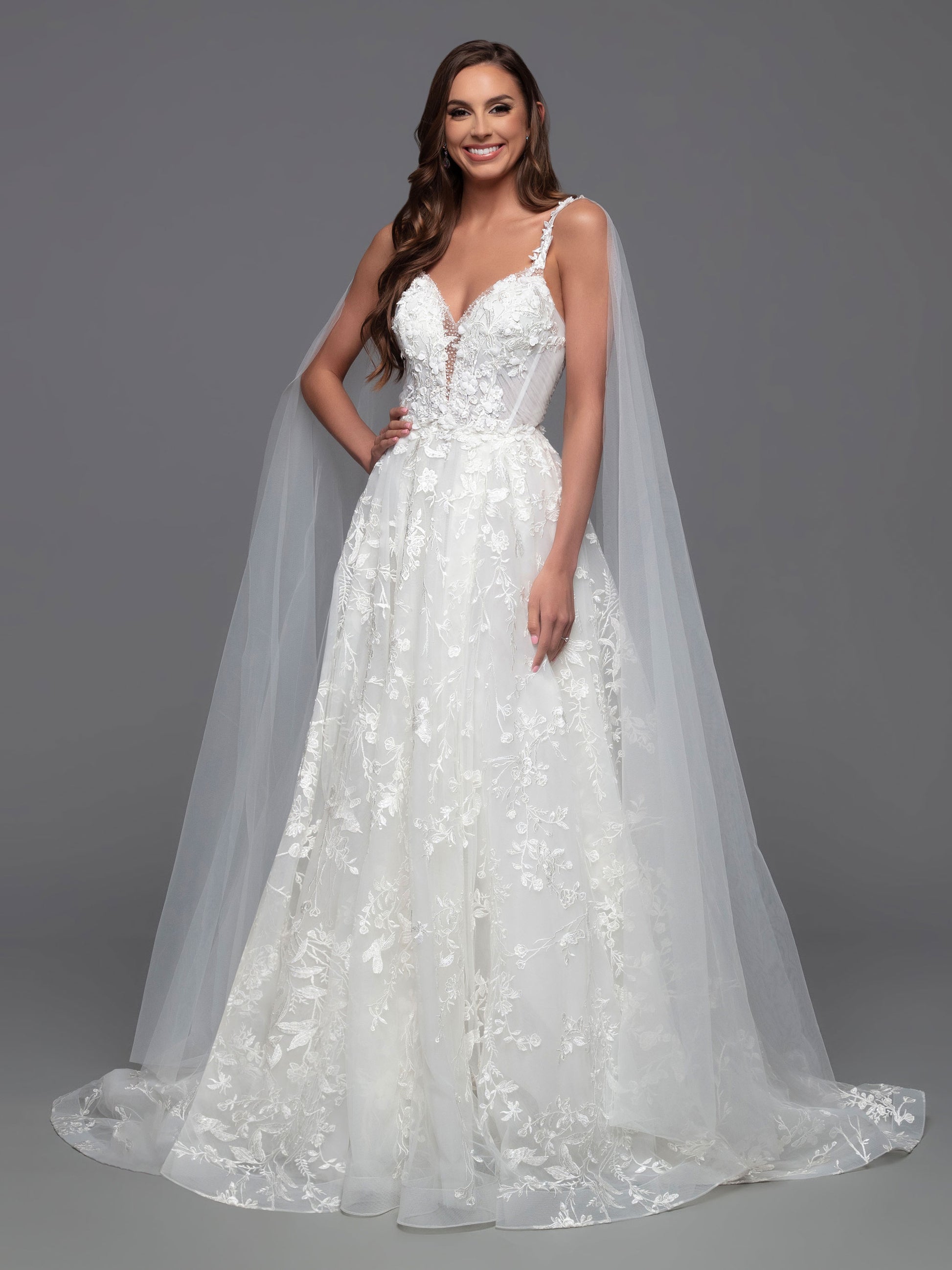 Look stunning on your special day in this Davinci Bridal 50806 A Line Lace Cape Wedding Dress. Constructed with a sheer crystal plunging neckline and 3D floral embroidery on the front and back bodice, this gown provides an exquisite look with gathered skirt and chapel train. Plus, you can customize your look and stand out in photos with the addition of the detachable veil wings.