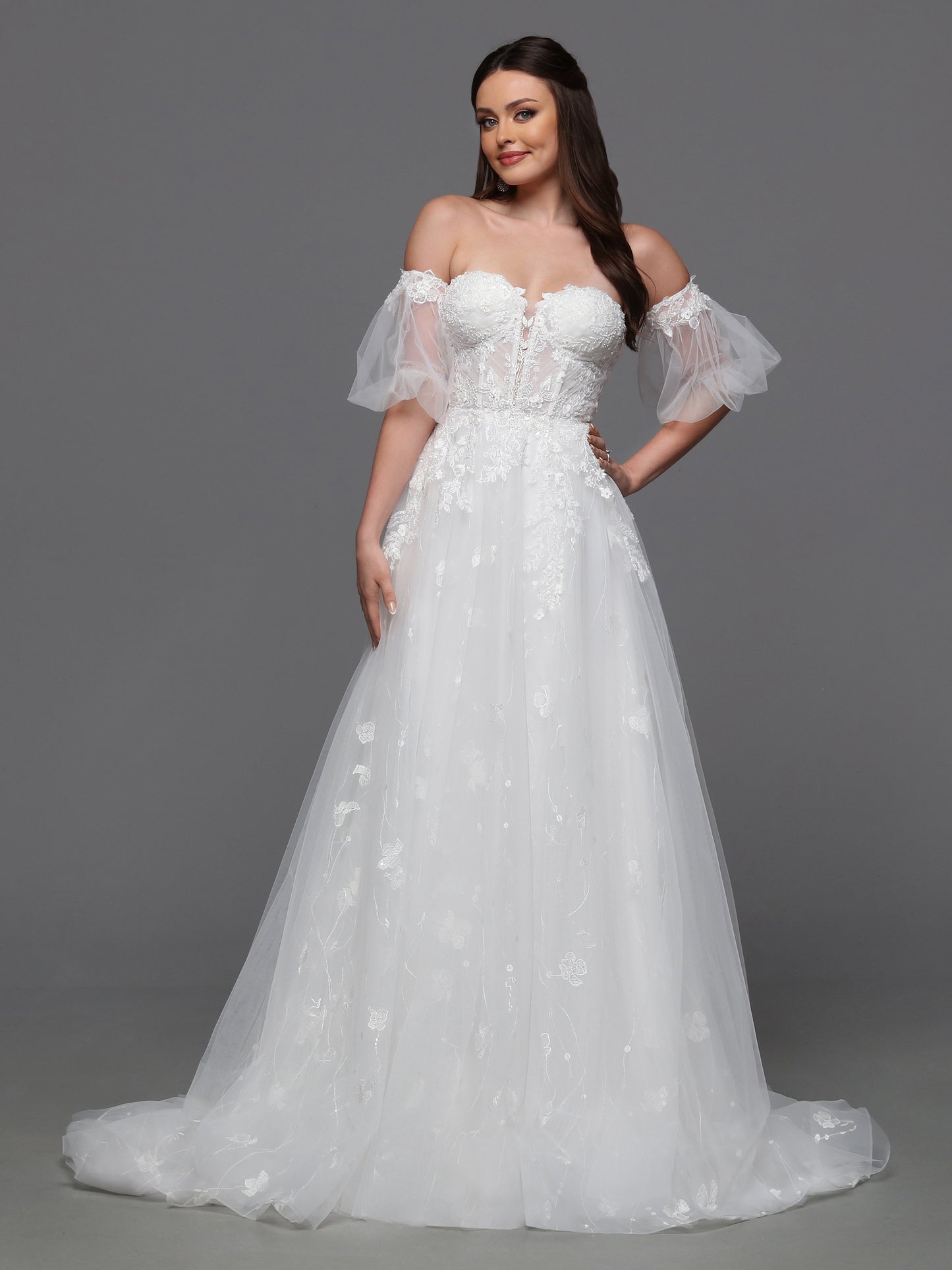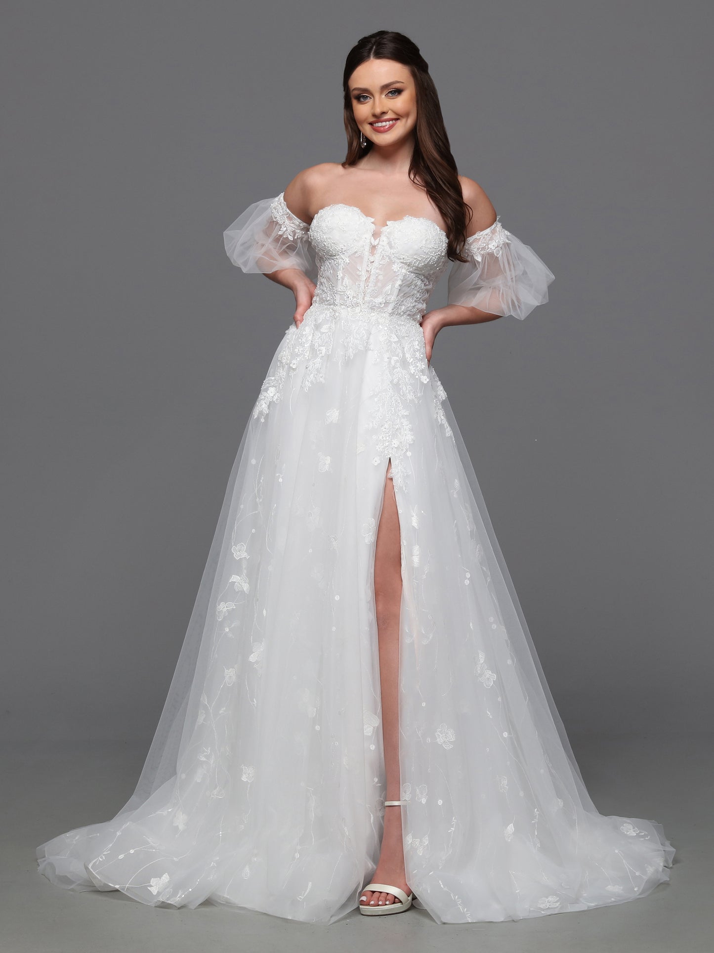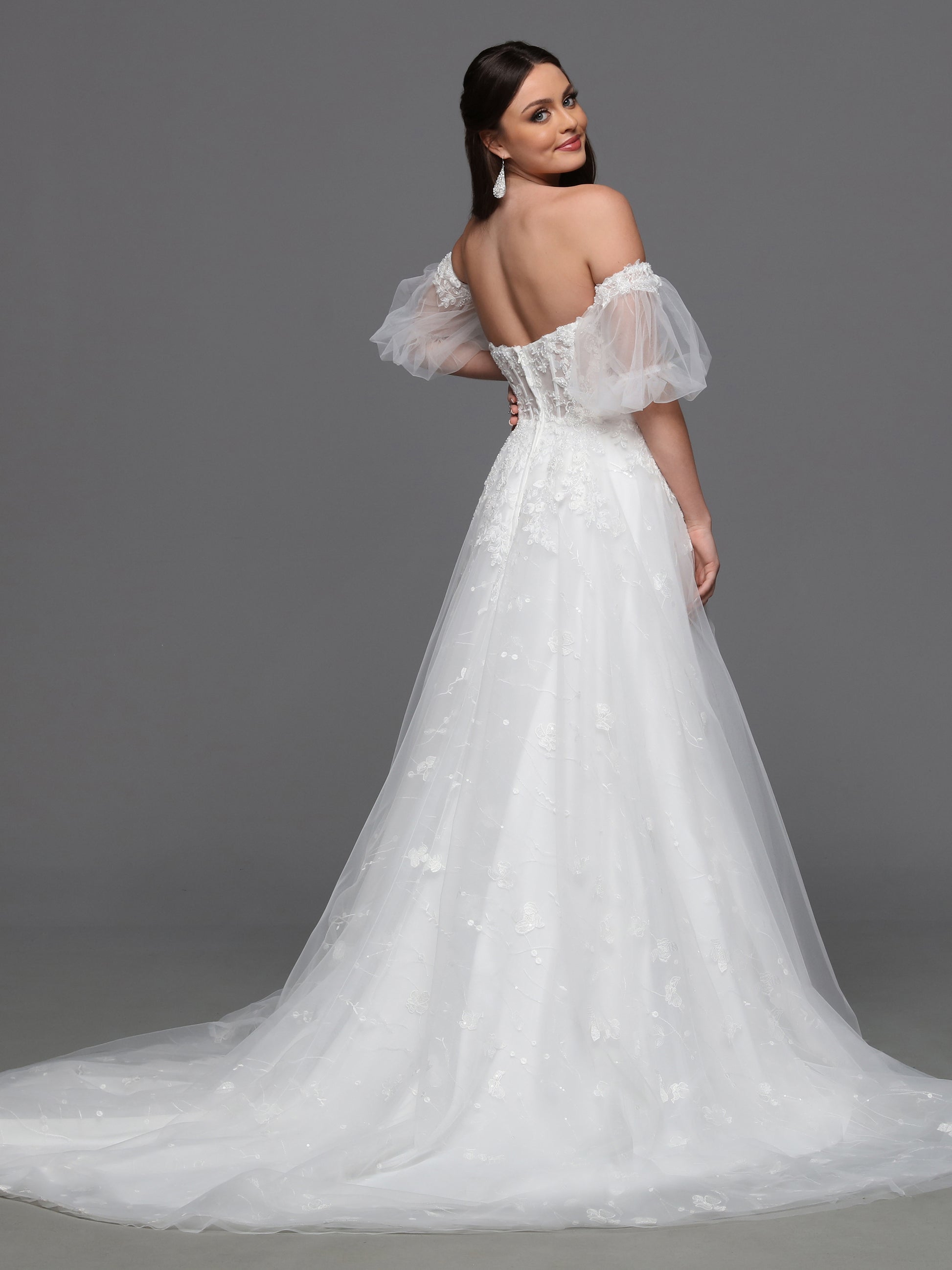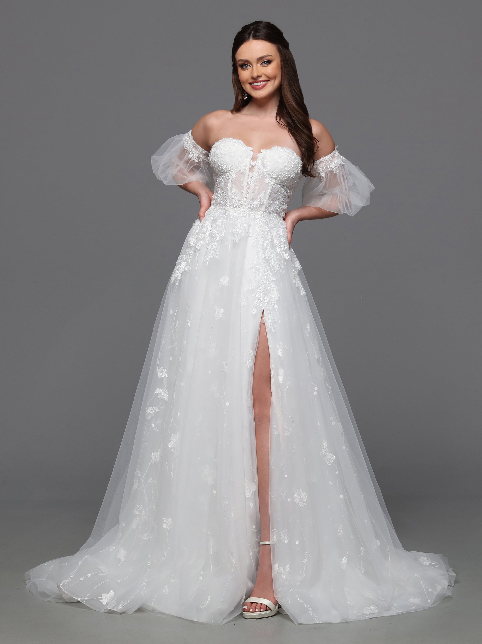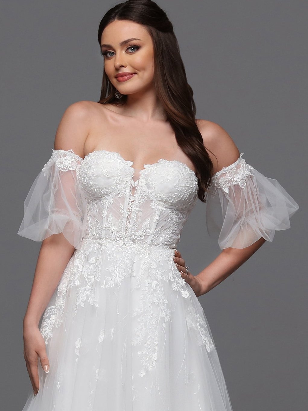 Make a statement on your special day with the Davinci Bridal 50836 A line Puff Sleeve Wedding Dress. The sheer corset enhances your silhouette while the beaded accents add a touch of glamour. With a slit for effortless movement and luxurious puddle sleeves, this dress exudes elegance and sophistication. Flirty and fashionable, this ball gown wedding dress has a sheer lace bodice, peek-a-boo slit skirt and delicate detachable sleeves.