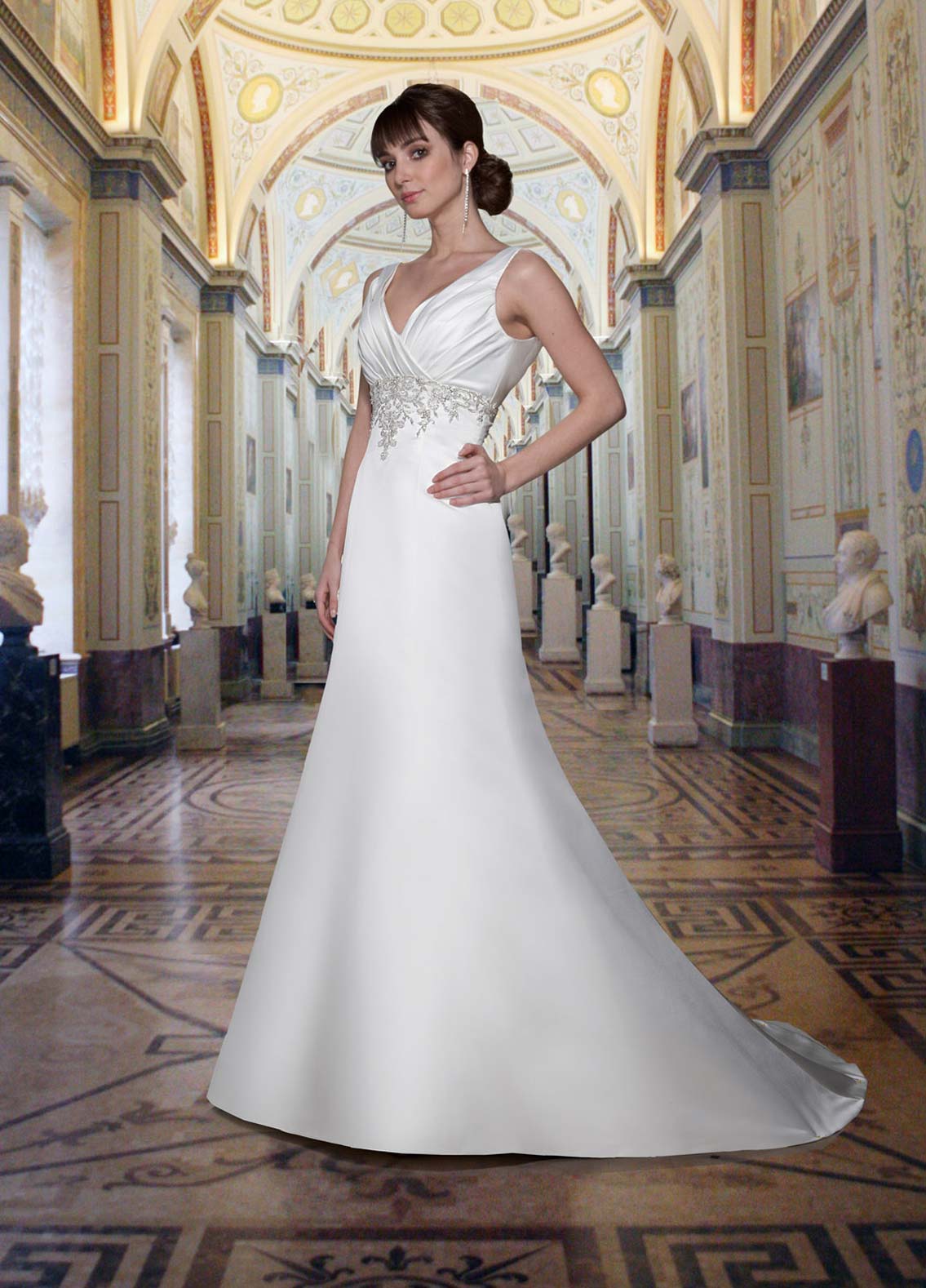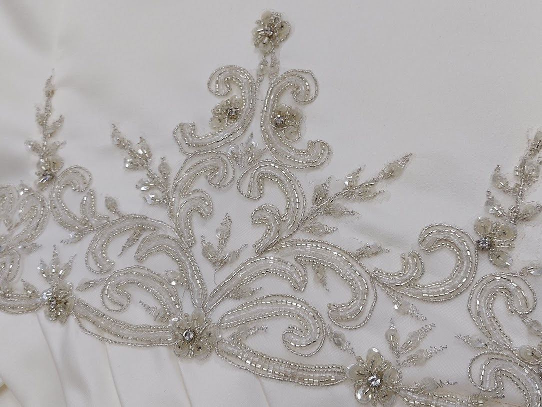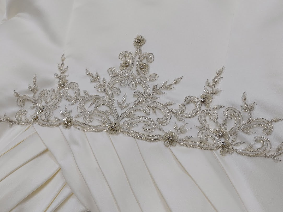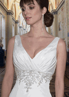 Davinci Bridal 8373 is a Gorgeous Heavy Sating Bridal Gown. This Plus size wedding dress features a Heavy Ivory Satin material with a pleated bodice with a V neckline and wide straps. Detailed Embellishments & Beading accent the waist line all the way around. The intricate beading, sequins & crystal create the illusion of embroidered lace with a more detailed & Glam Affect. Simple A Line silhouette.