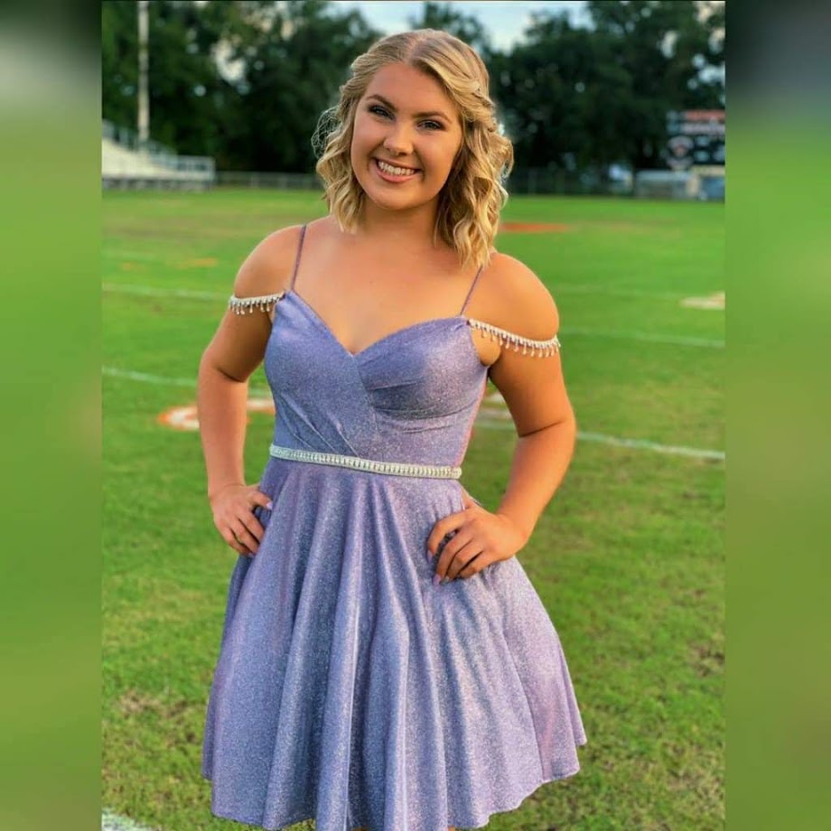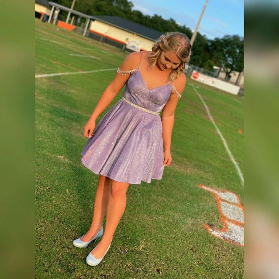 Dancing Queen 3173 Be fascinated with the sheer elegance of this Iridescent shimmering short cocktail dress. Sculpted in a metallic glitter fabric, this enticing piece flourishes a sweetheart neckline on a pleated surplice bodice. Draped with bejeweled straps, the back is nipped with a lace up detail as the A-line skirt creates a short flared hem. Captivate everyone with the sheer beauty of this off the shoulder formal short dress. Crystal rhinestone waist belt. Pockets!