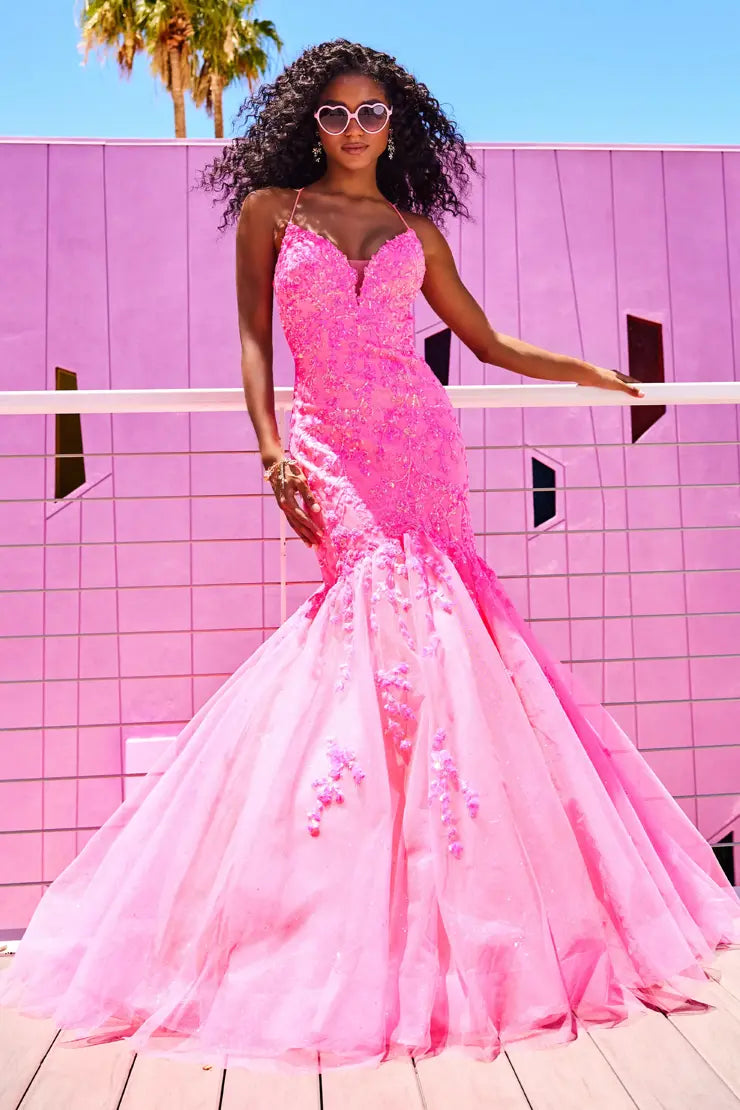 Ellie Wilde EW34011 Size 8 Hot Pink Prom Dress Sequin Backless Corset Mermaid Shimmer Formal Gown V Neck