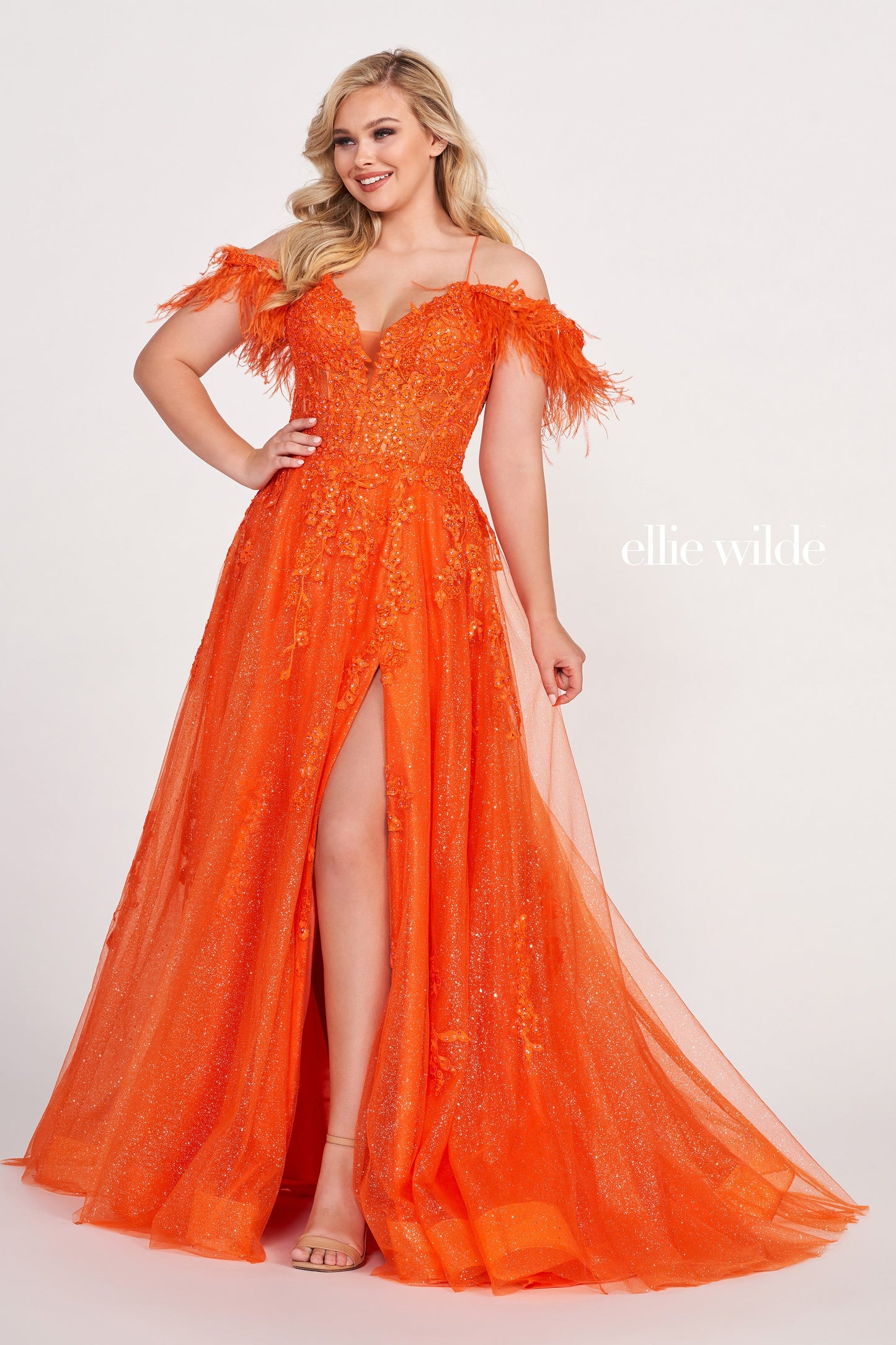 The Ellie Wilde EW34066 is a stunning A-line gown with a sheer sequin corset and feather off-the-shoulder detail. Boasting a dazzling shimmer finish and dramatic slit, this exquisite dress will make you the belle of the ball.