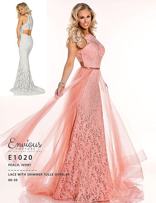 Envious Couture by Karishma Creations 1020 is a long fitted soft lace formal gown with an over skirt. Sheer Illusion Lace High Neckline with a Cutout open back and sheer lace coverage. Fit & Flare Silhouette with sweeping train. Detachable Tulle Skirt with multiple layers of Soft Tulle, Glitter Tulle & Tulle with a horse hair trim. Stunning Lush Train. Great for prom, Pageant, wedding guest, Mother of the bride/groom. Great wedding dress or unique bridal gown with a magical appeal.
