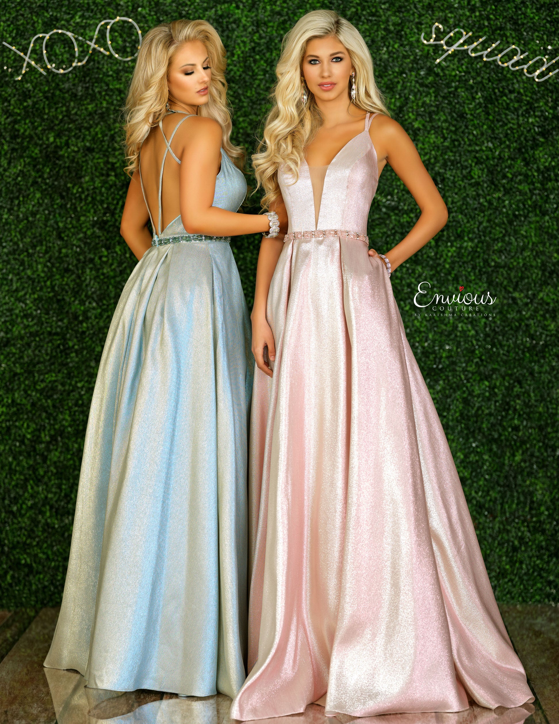Envious Couture E1439 by Karishma Creations is a 2020 Prom Dress, Pageant Gown & Formal Evening Wear. This Gown is an Elegant Iridescent Shimmer 2020 Prom Dress with a plunging V Neckline, Embellished waist band & pleated skirt. Mid rise back with strap pattern. 1439