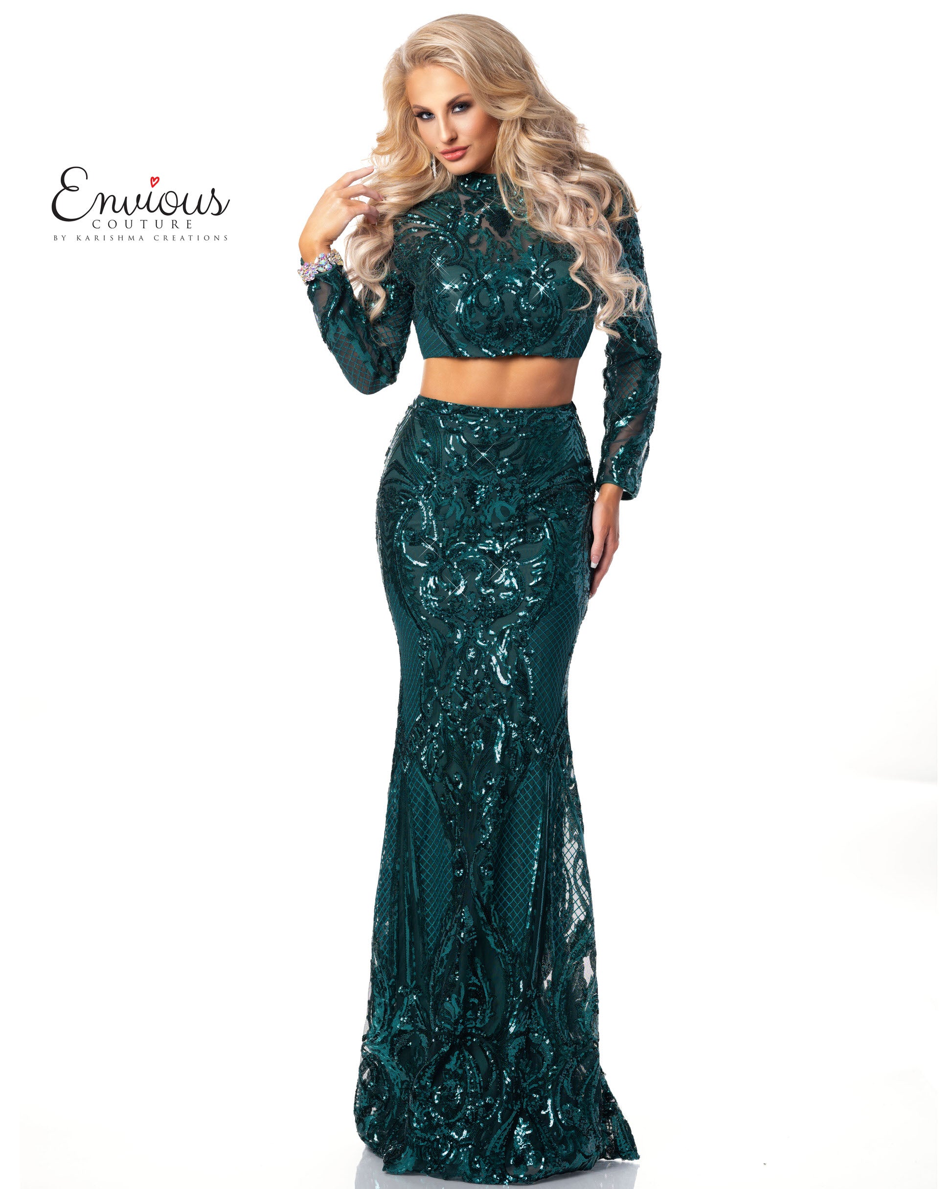 Envious Couture E1463 Size 2 Emerald Prom Dress long sleeve two piece sequin High Neckline