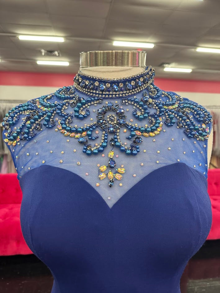 Envious Couture 16147 Size 8 Royal Blue prom dress pageant gown Slit Sheer High Neck