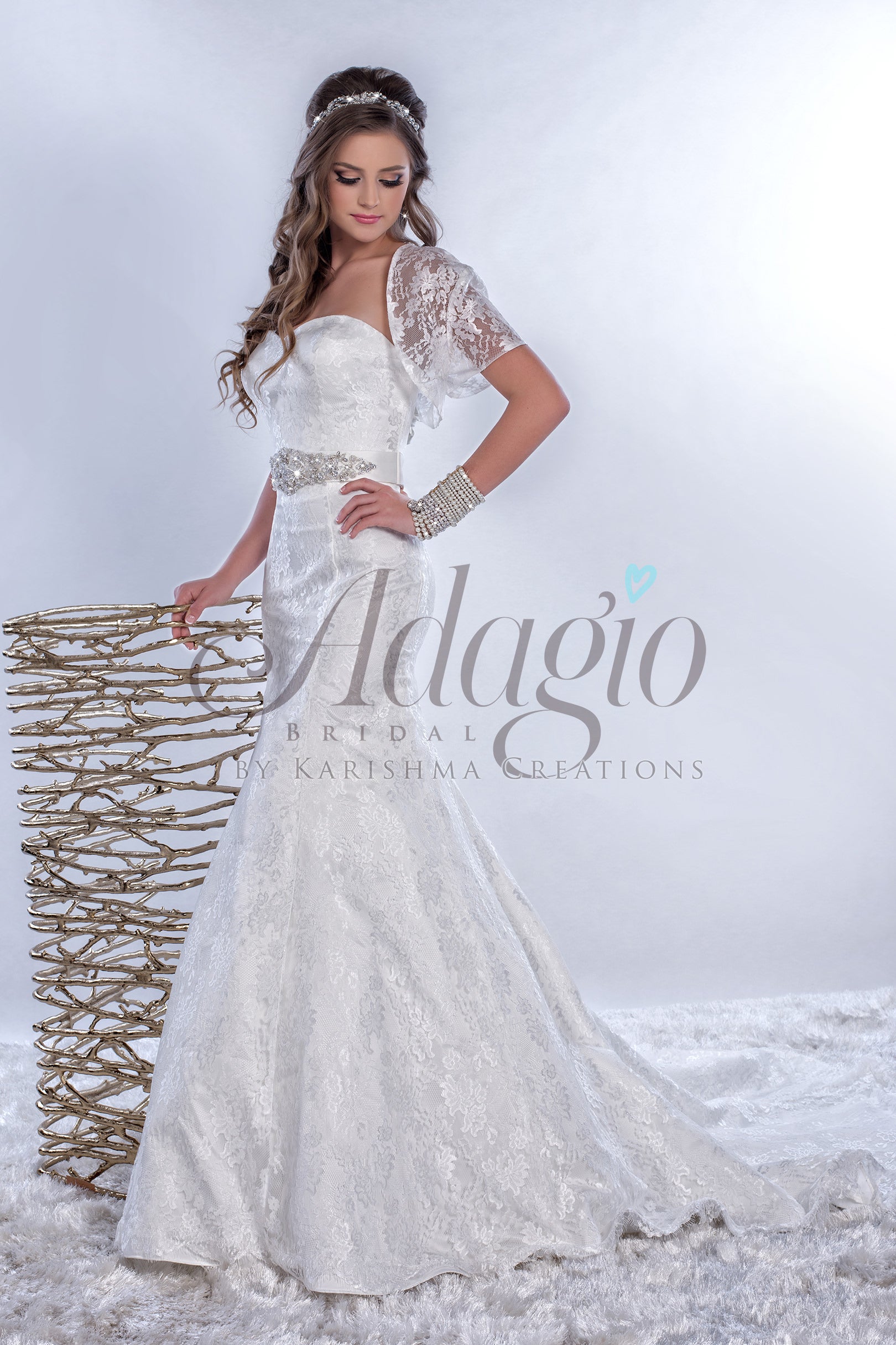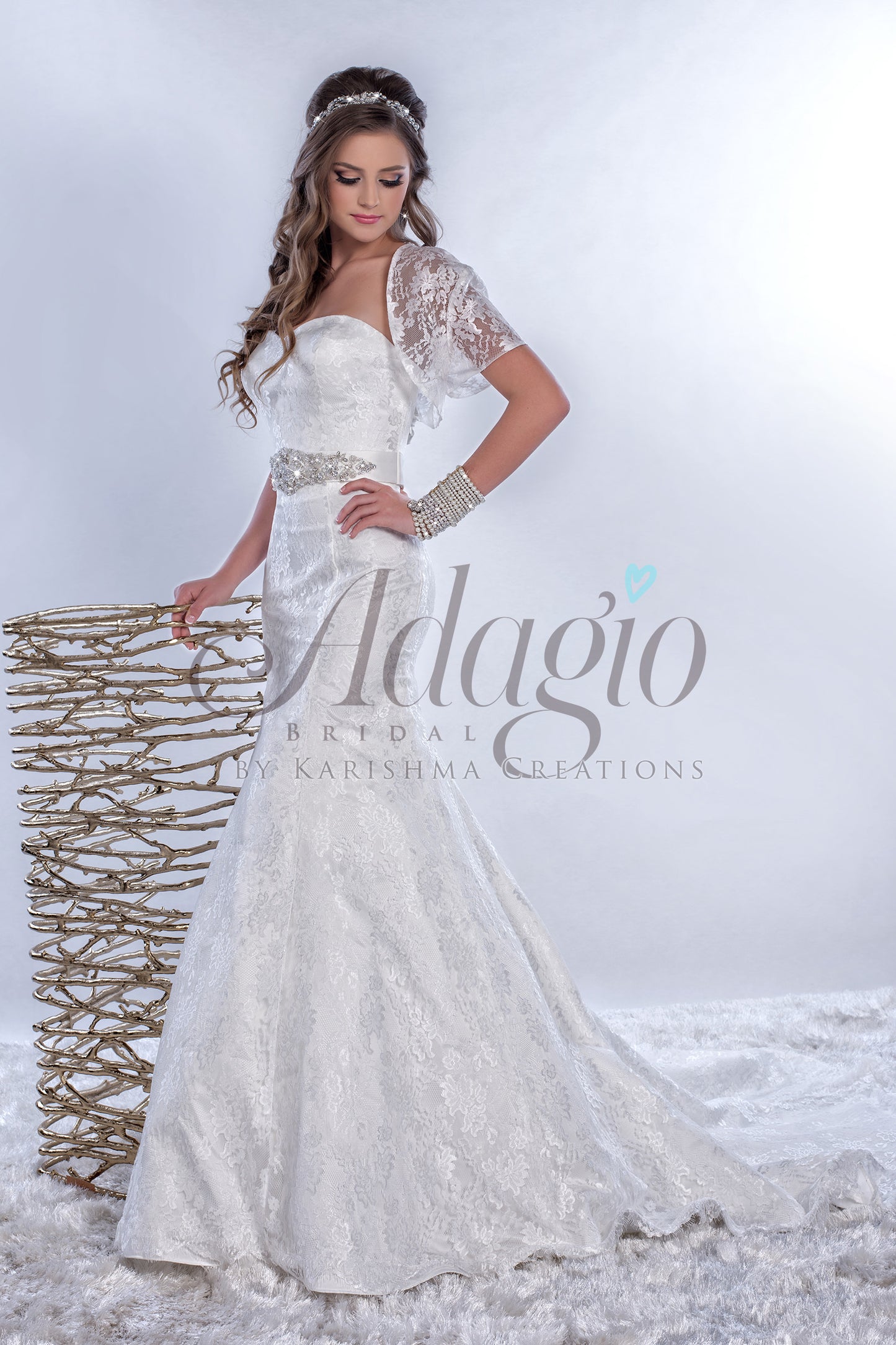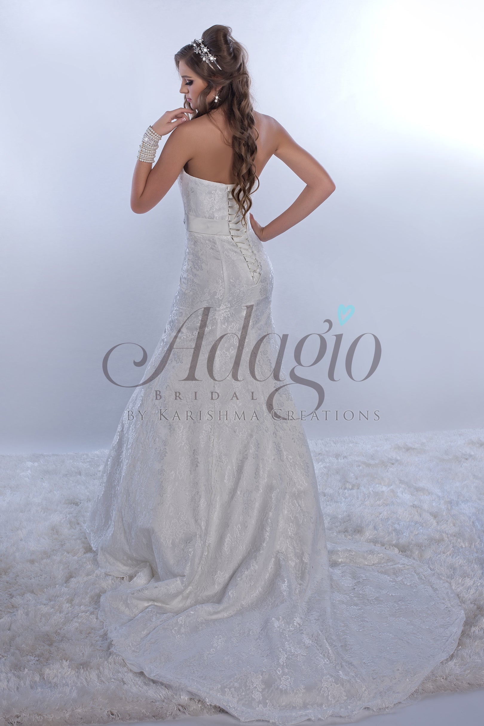 This beautiful fit and flare wedding gown features a sweetheart neckline and strapless bodice. Glittering embellishments adorn the bodice, while the mermaid skirt glides freely to a floor-length hemline. The fitted bodice highlights a brilliant bead panel at the waist for a vibrant look. Wedding Dress Bridal Gown Fit & Flare All over Lace Silhouette with an eyelash lace hem and beautiful train. Crystal Rhinestone embellished waist belt. Corset lace up back.