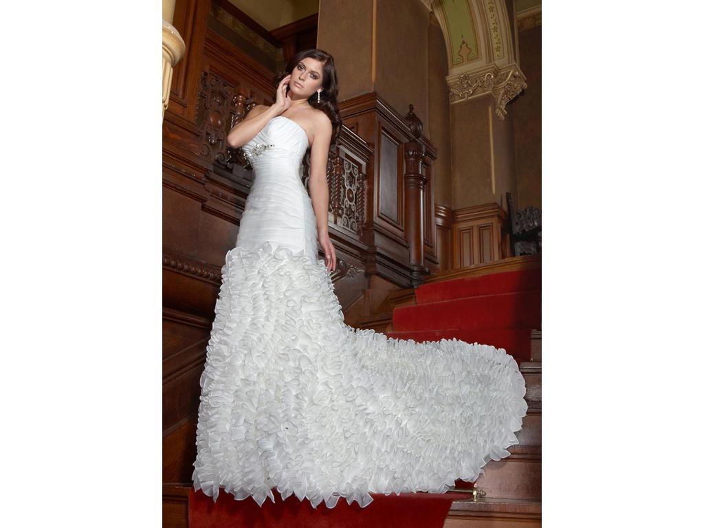 Impression Bridal 6807 is a gorgeous Fit & Flare Pleated Strapless sweetheart wedding dress. Featuring a beautiful crystal embellished under bust and gathered asymmetrical bodice. Fit & Flare trumpet skirt has a lush ruffled design with a gorgeous sweeping traim. Button lined back zipper.