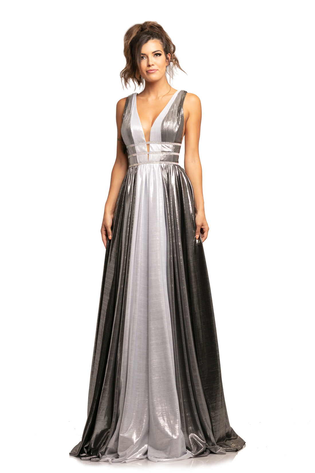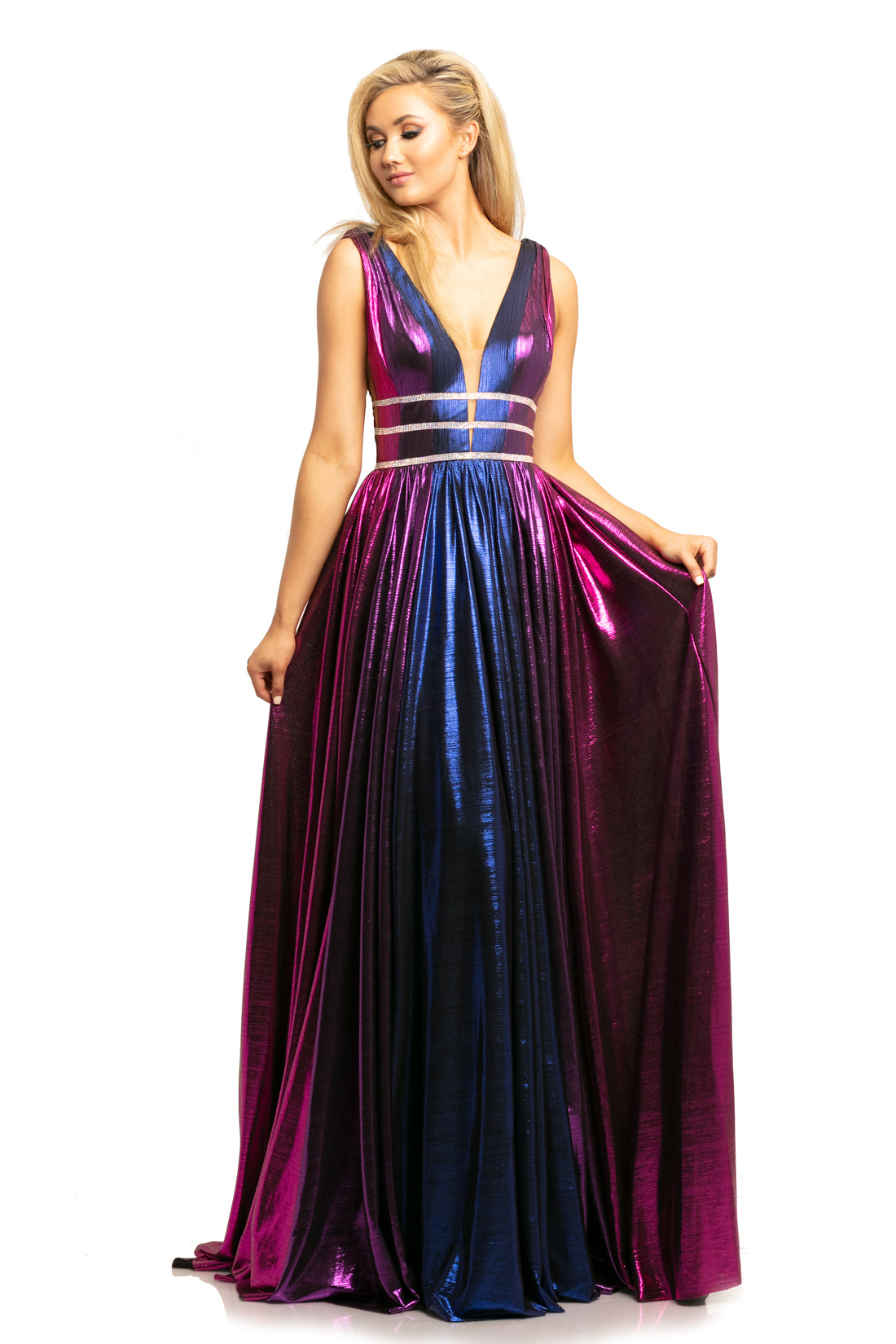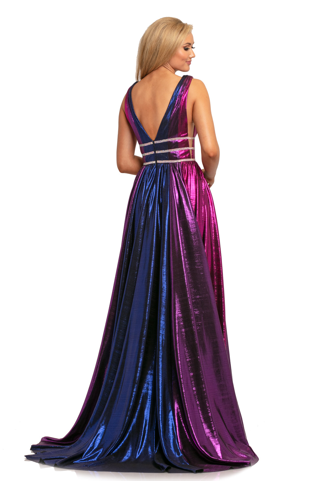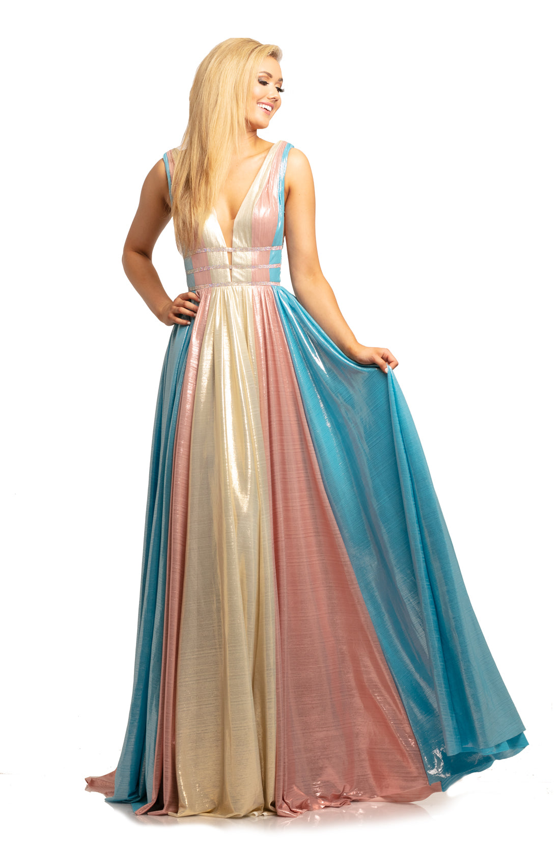 Johnathan Kayne 2008 is a Metallic Multi Color Prom Dress, Pageant Gown & Formal Evening Wear! This gown Features a Metallic Shimmer Multi Color Material. Deep V Plunging Neckline with a triple Crystal Embellished Waist Band. Sheer mesh Cutout side panels. Open V Back. The Pleated Skirt Features Yards of extra material for a lush look with the dimensional colors