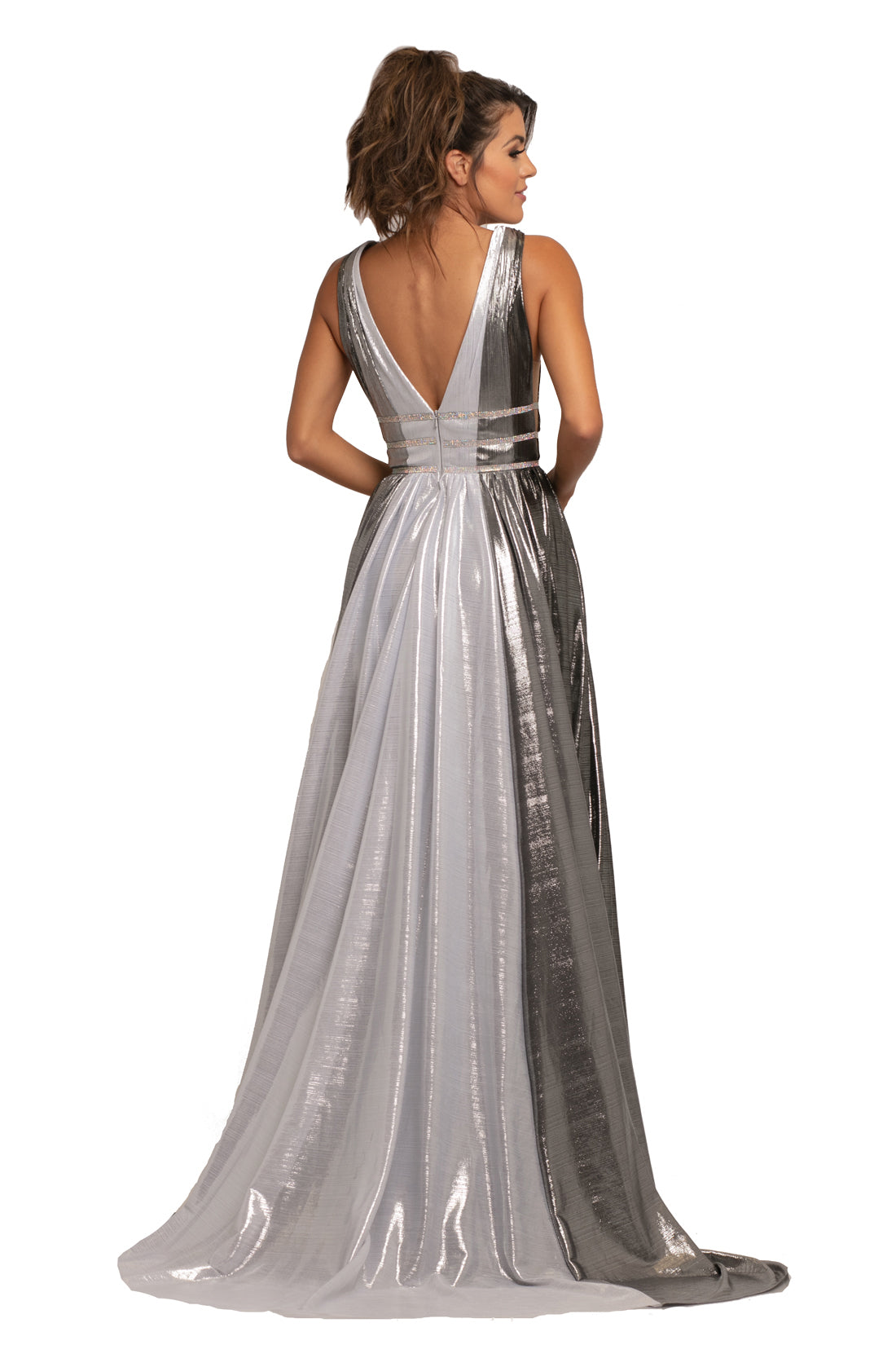 Johnathan Kayne 2008 Size 10 Silver/Multi Metallic Shimmer Prom Dress Plunging Neckline Pageant Gown