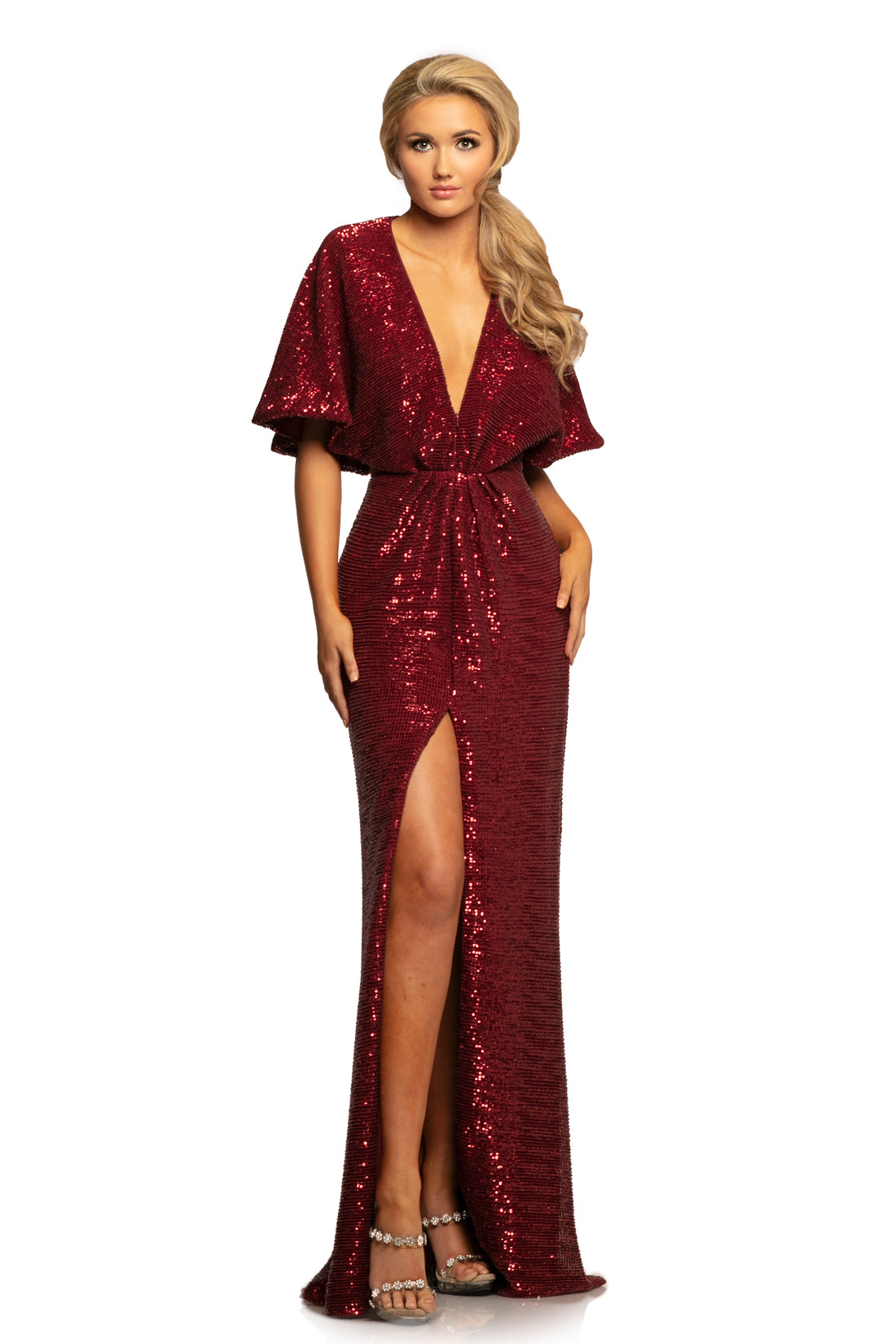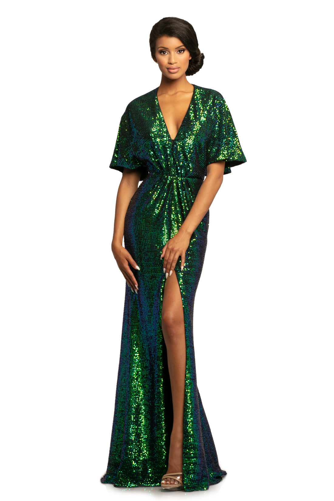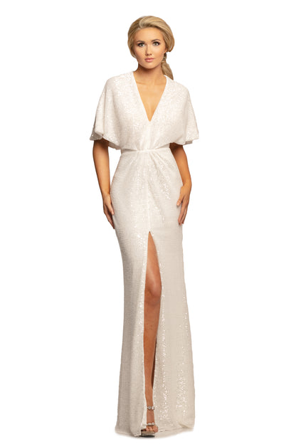 This Sequin Embellished Gown Features A Deep V Neck with draping sleeves and a ruched bodice for a curvy fit. Slit in the front level with the deep neckline. Great Sophisticated wedding dress in white or Fun Modern Prom Dress in Mermaid!