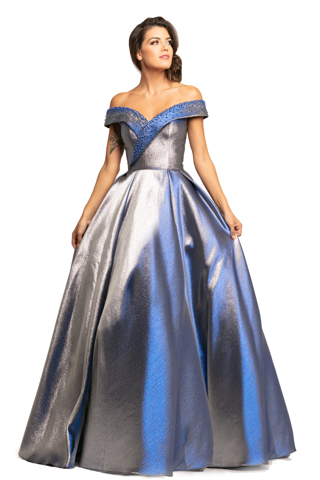 Johnathan Kayne 2072 is a Blue silver Off the Shoulder Prom Dress, Pageant Gown & Formal Evening Wear. Featuring a Metallic Shimmer Brocade Material. This Ballgown has a full Pleated skirt, Fitted Off the Shoulder Bodice with pearl embellishments.