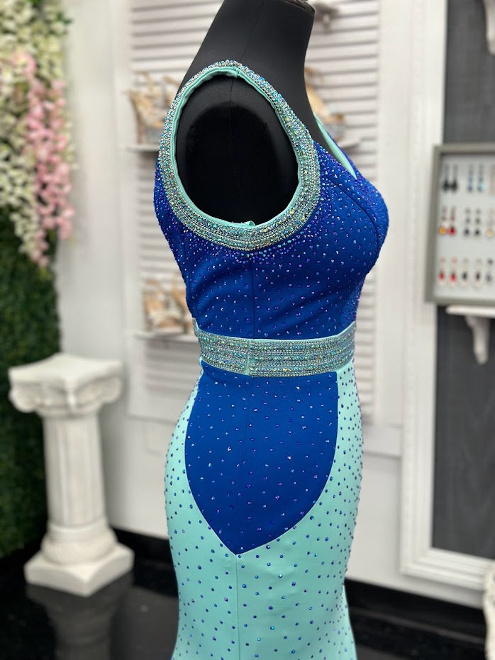 The Johnathan Kayne 2628 is a glamorous pageant dress, crafted from fitted scuba for a sleek and form-flattering effect. The gown features a crystal accented waist line, shoulder straps and v neckline with scattered crystals and glittering accents, making it perfect for special occasions. With its comfortable fit and elegant design, this size 4 dress adds sparkle to any ensemble. Color Block Combo.