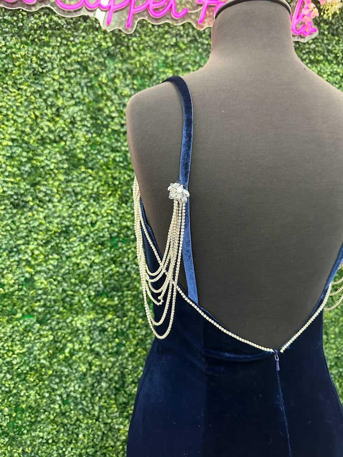 This Johnathan Kayne 2706 gown features a long fitted velvet silhouette with a pleated mermaid skirt and elegant train, designed to enhance your figure with sophisticated flair. The off-the-shoulder sleeves are adorned with a detachable crystal fringe tassel, adding a touch of sparkle and versatility. Perfect for pageants or formal events, This velvet dress combines classic elegance with modern detailing for a standout look.