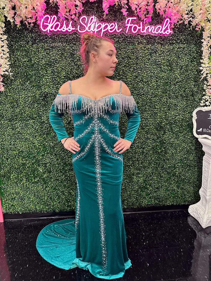 Johnathan Kayne 2708 Size 6 Teal Long Velvet Crystal Fringe Tassel Off the Shoulder Pageant Gown Prom Dress