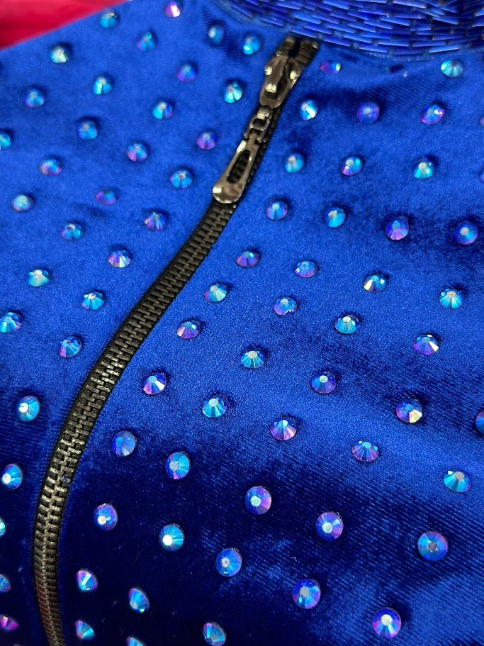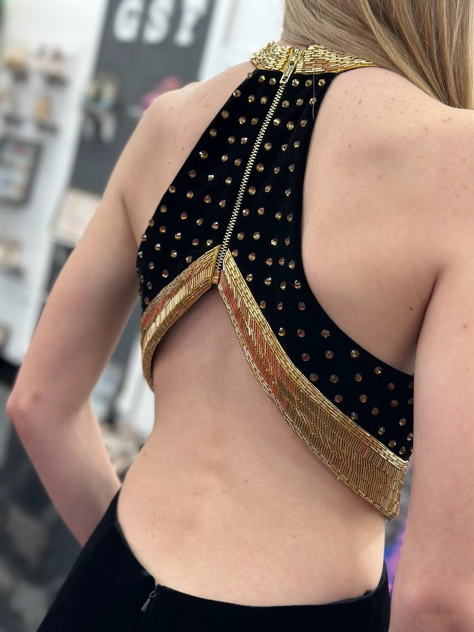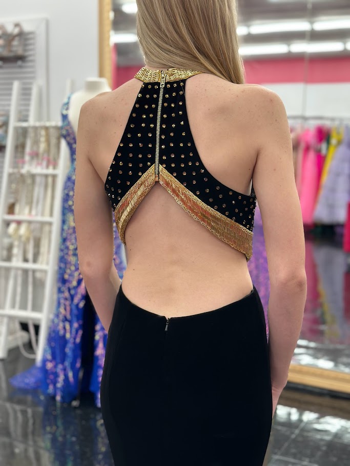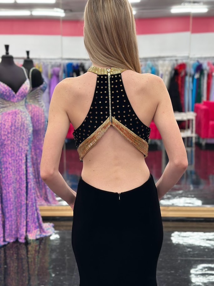 Johnathan Kayne 2711 Long Sleeve Velvet Backless Dress Zipper Neckline Liquid Beaded