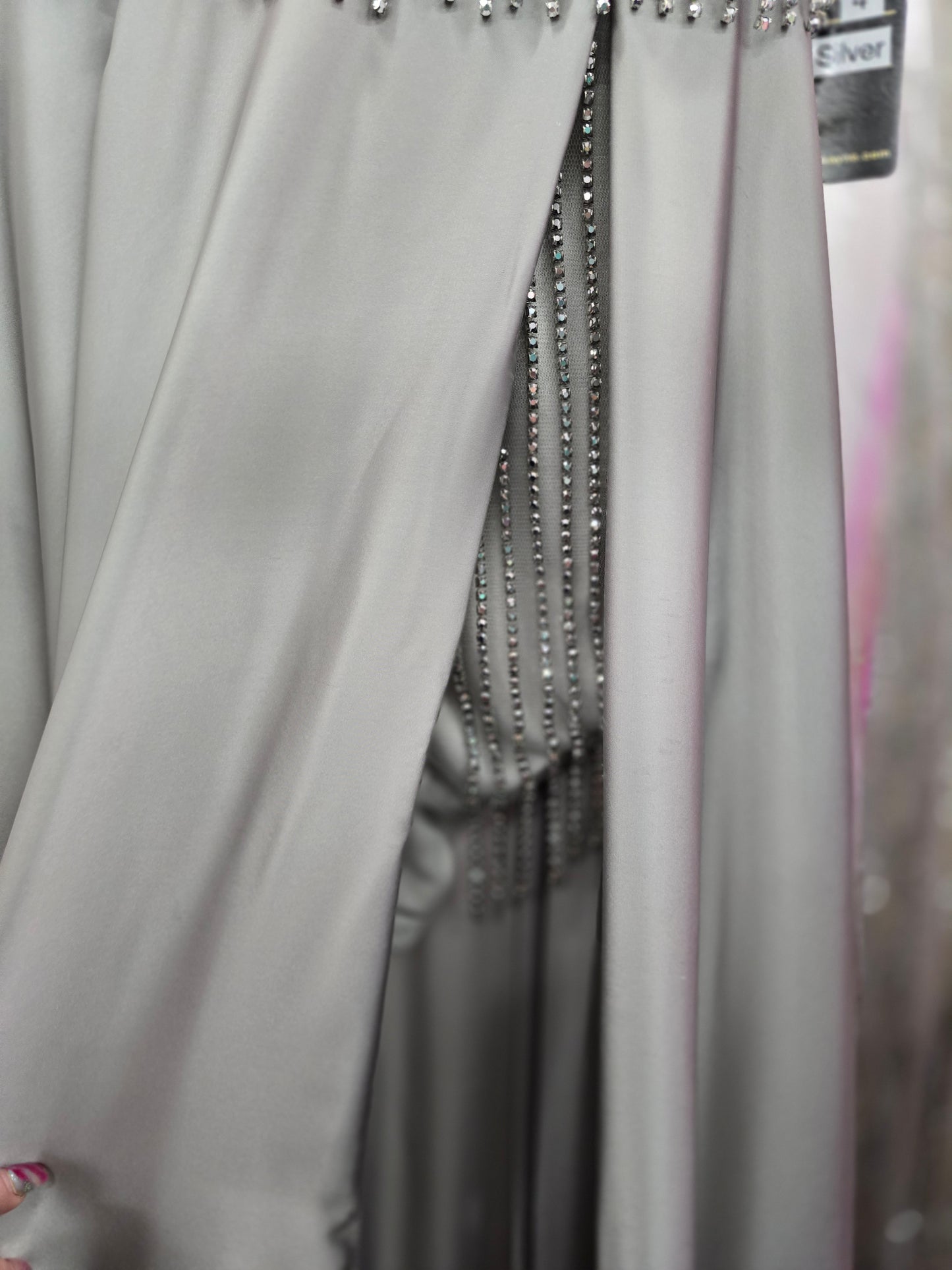 Johnathan Kayne 2748 Size 4 Silver Plunging fringe sequin open v neck sequin maxi slit long dress