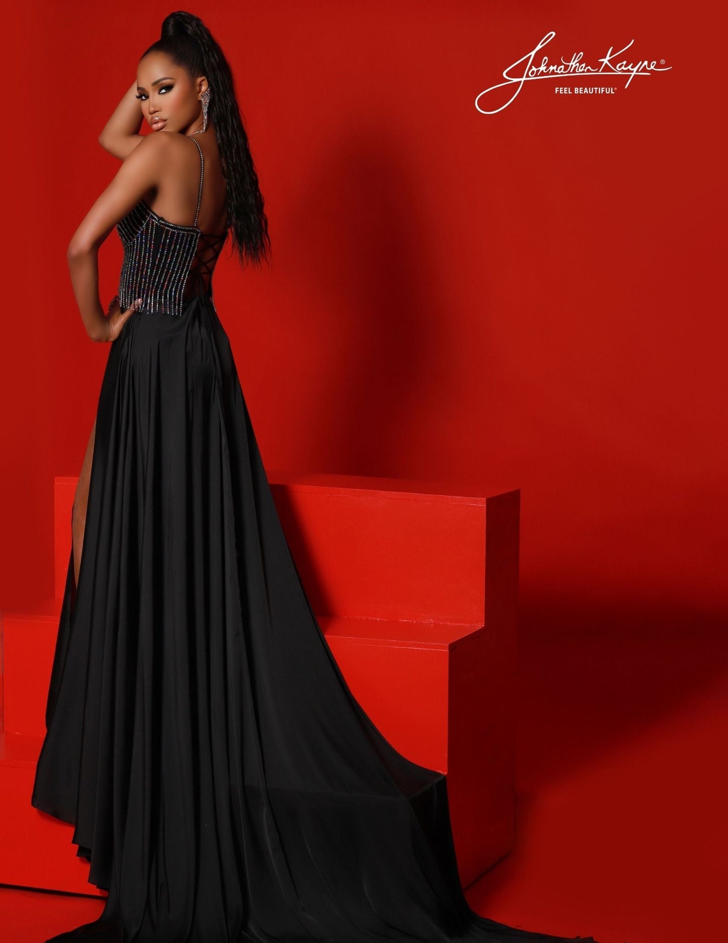 Take a daring new step in the Johnathan Kayne 2748 dress. Matching sequin elements add sparkle to the plunging V-neckline, fringe detailing and long side slit that make this maxi an unforgettable statement piece. Reach out and captivate the world with this daring style!