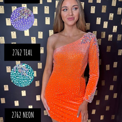 Johnathan Kayne 2762 short velvet cocktail dress one shoulder long sleeve stretch velvet crystals throughout homecoming dress AB crystal shoulder and wrist details.