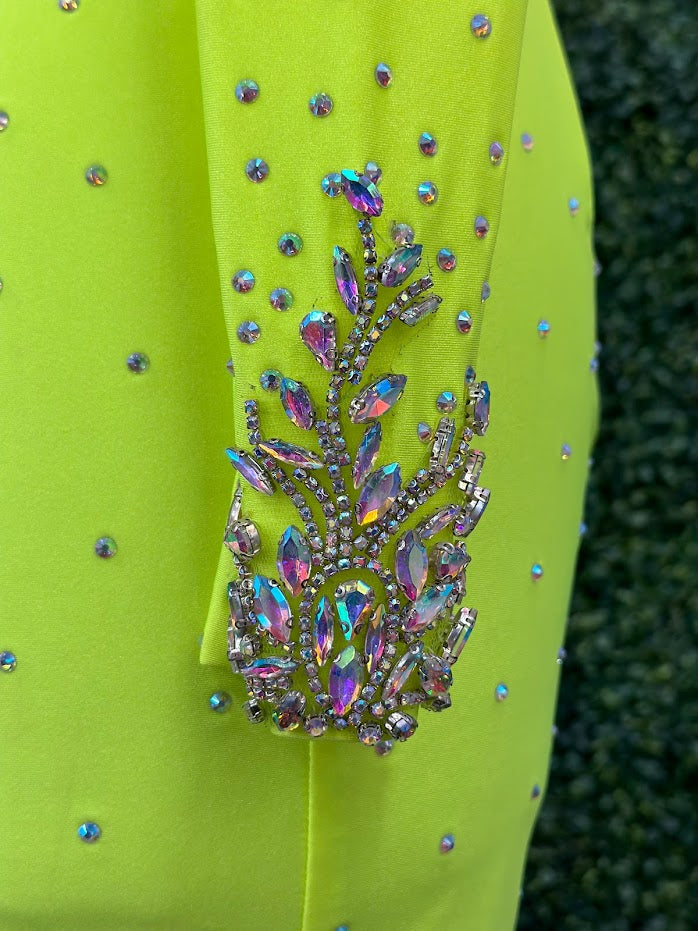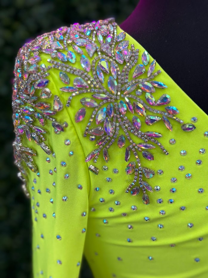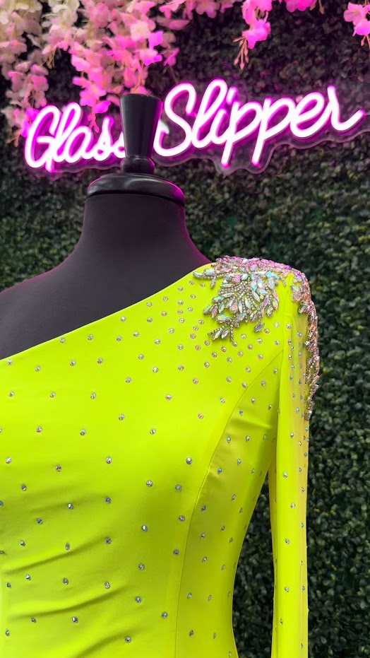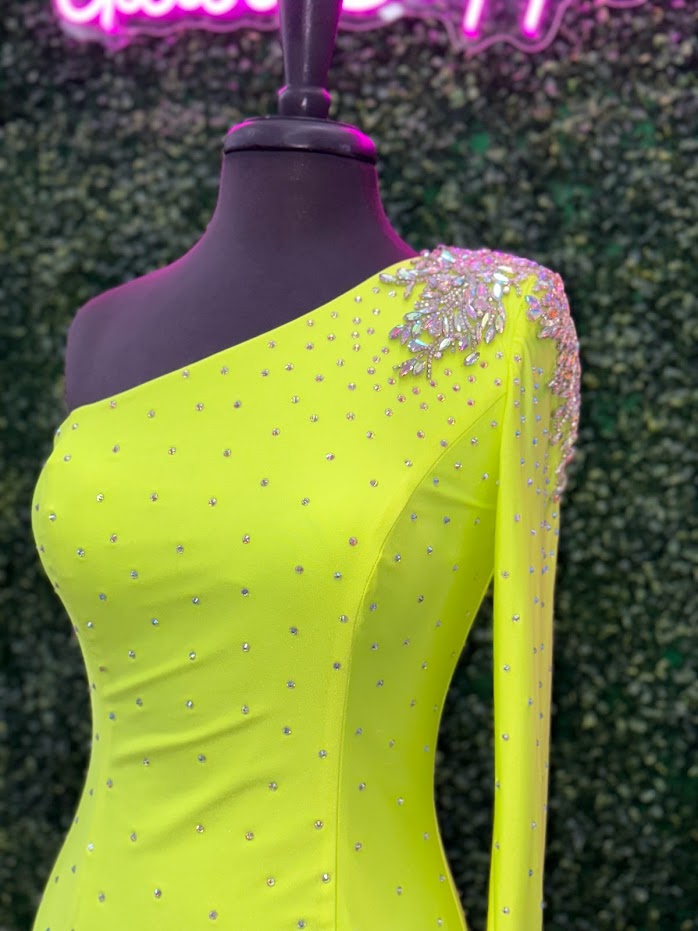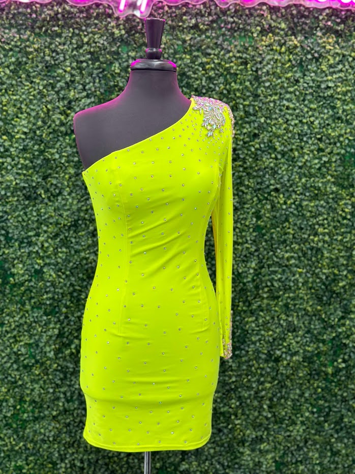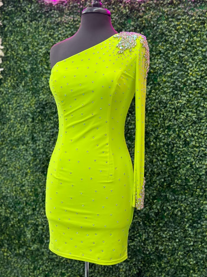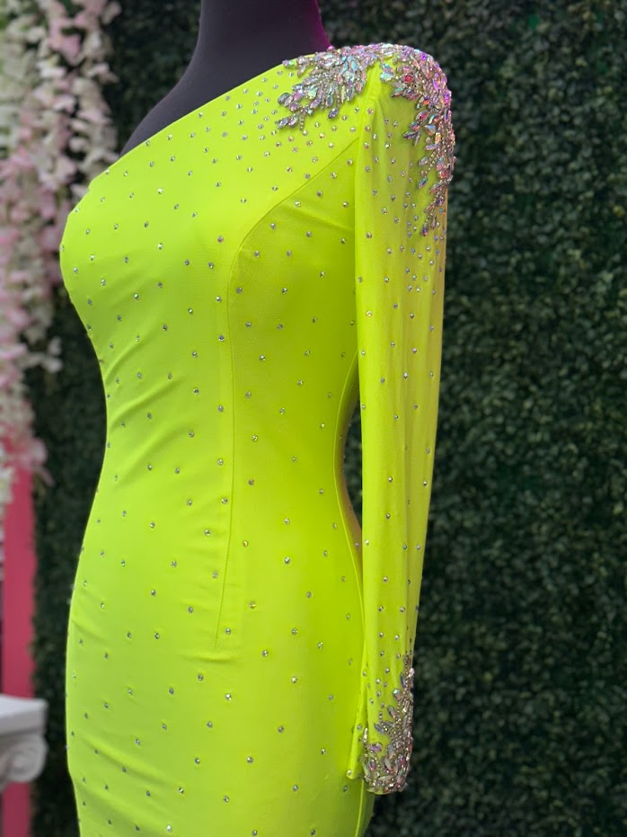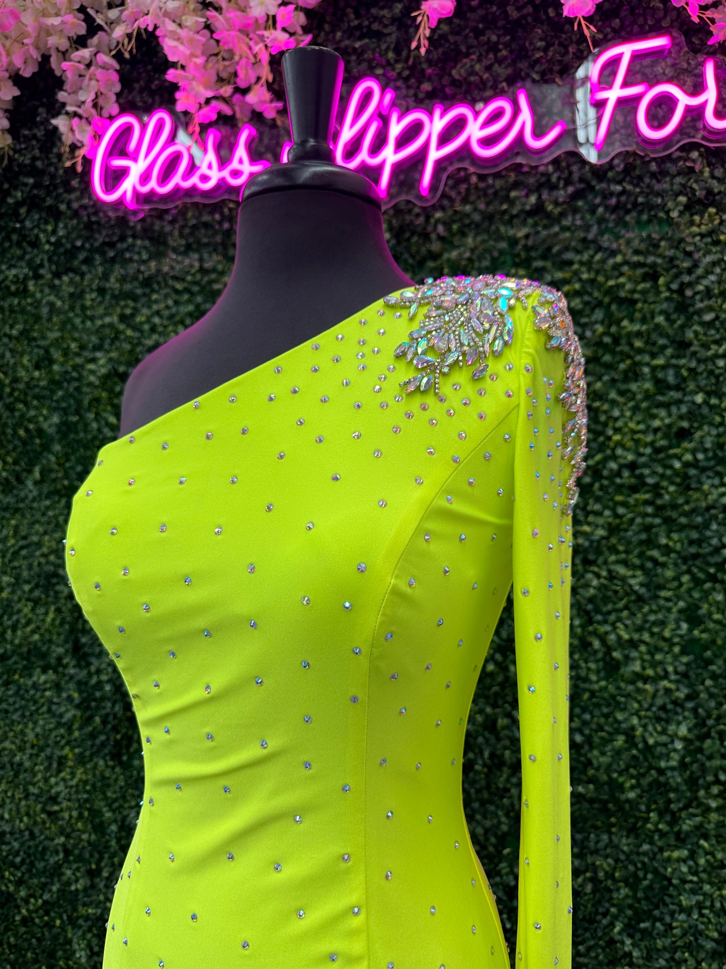 Johnathan Kayne 2785 Size 4 Neon Green Short One shoulder long sleeve crystal Cuff Dress stoned bodice short homecoming dress