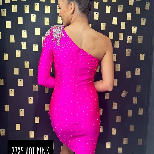 This Johnathan Kayne 2785 dress is perfect for your homecoming event. It features a single crystal shoulder, long sleeve with crystal wrist line, and stoned bodice for a sparkling look. It is also fitted for a flattering silhouette. Perfect for a memorable night.