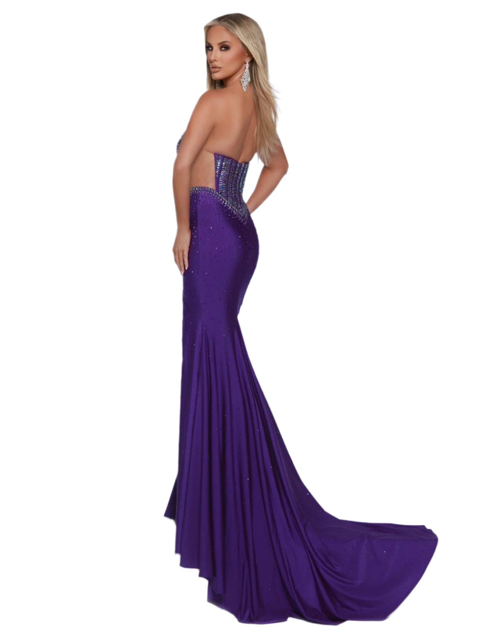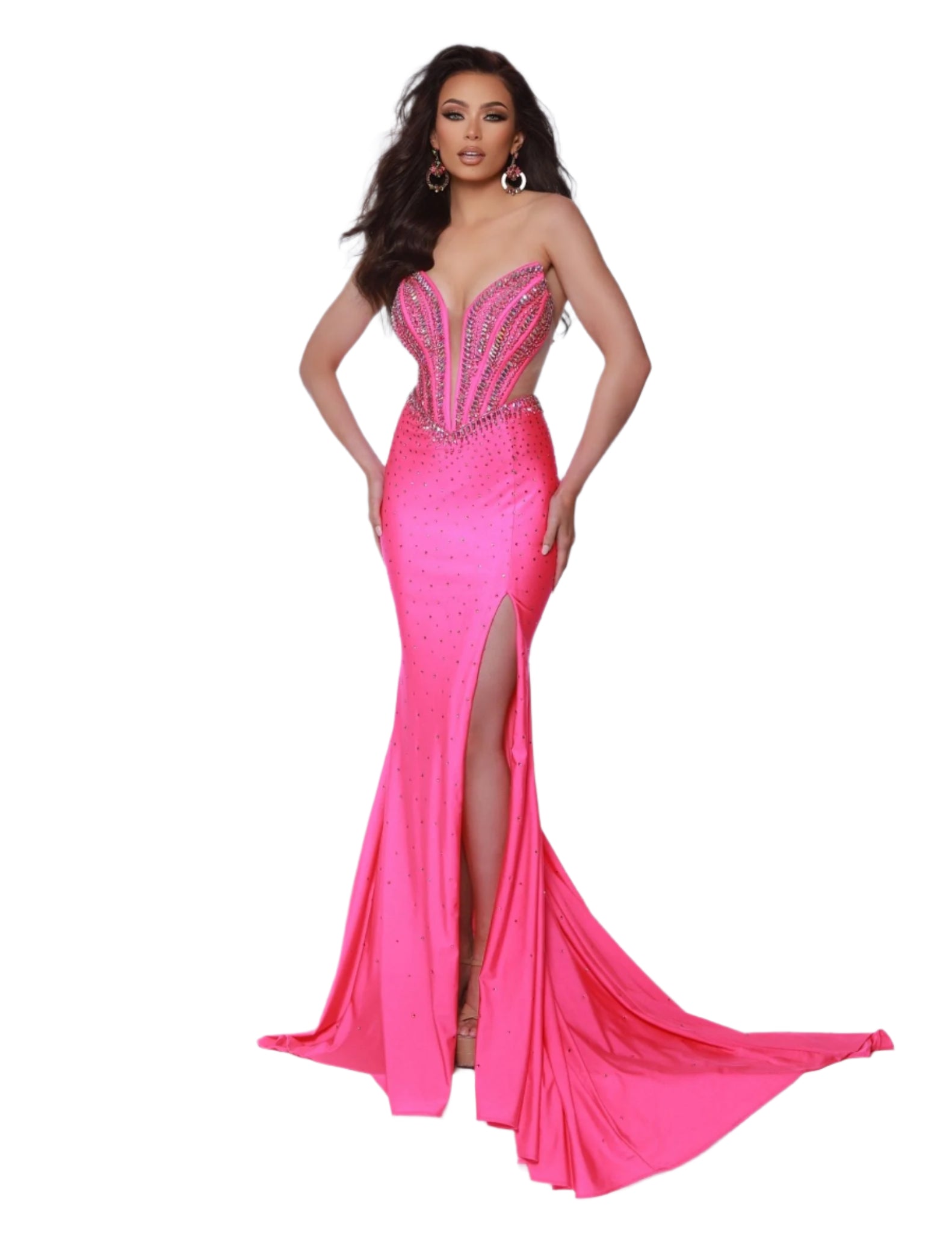 The Johnathan Kayne 3001 Sheer Cut out Crystal Slit Prom Dress is designed to make you stand out at any formal event. With a plunging neckline and sheer cutouts, this dress will highlight your figure while the crystal embellishments add a touch of glamour. Perfect for proms, pageants, and other special occasions. Get ready to slay the prom game in this strapless beauty featuring a daring plunge and flattering mesh cutouts. Whether you're striking a pose or dancing, this dress has just the right amount of pizazz to make you SPARKLE!