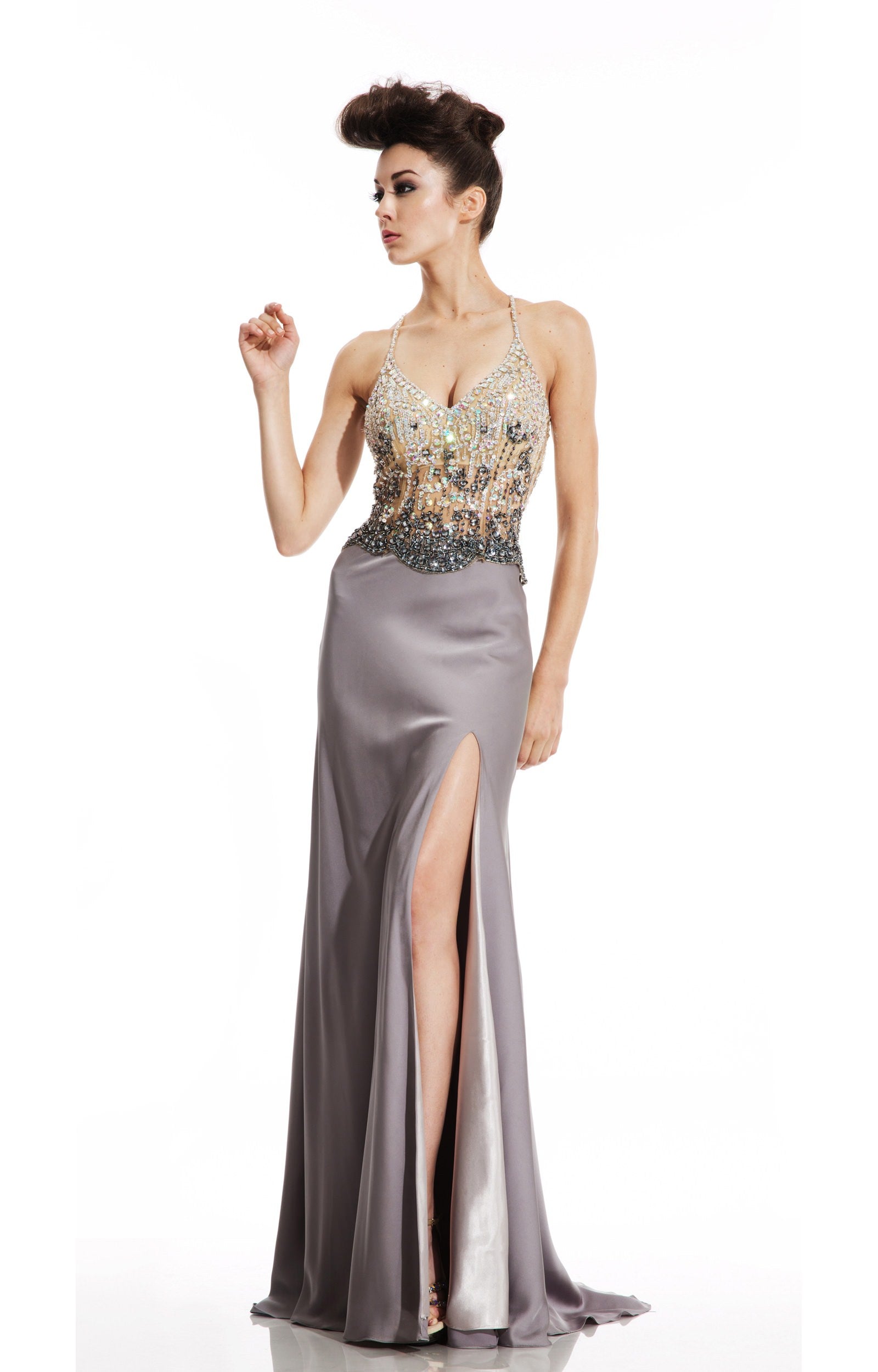Johnathan Kayne 456 Sheer Crystal Embellished V Neck Formal Evening Gown with a Satin skirt with a slit. embellished bodice with scallop edge waistline. Adjustable spaghetti straps to reduce the need for alterations! satin prom dress Formal Evening gown for balls, weddings, celebrity events & more!