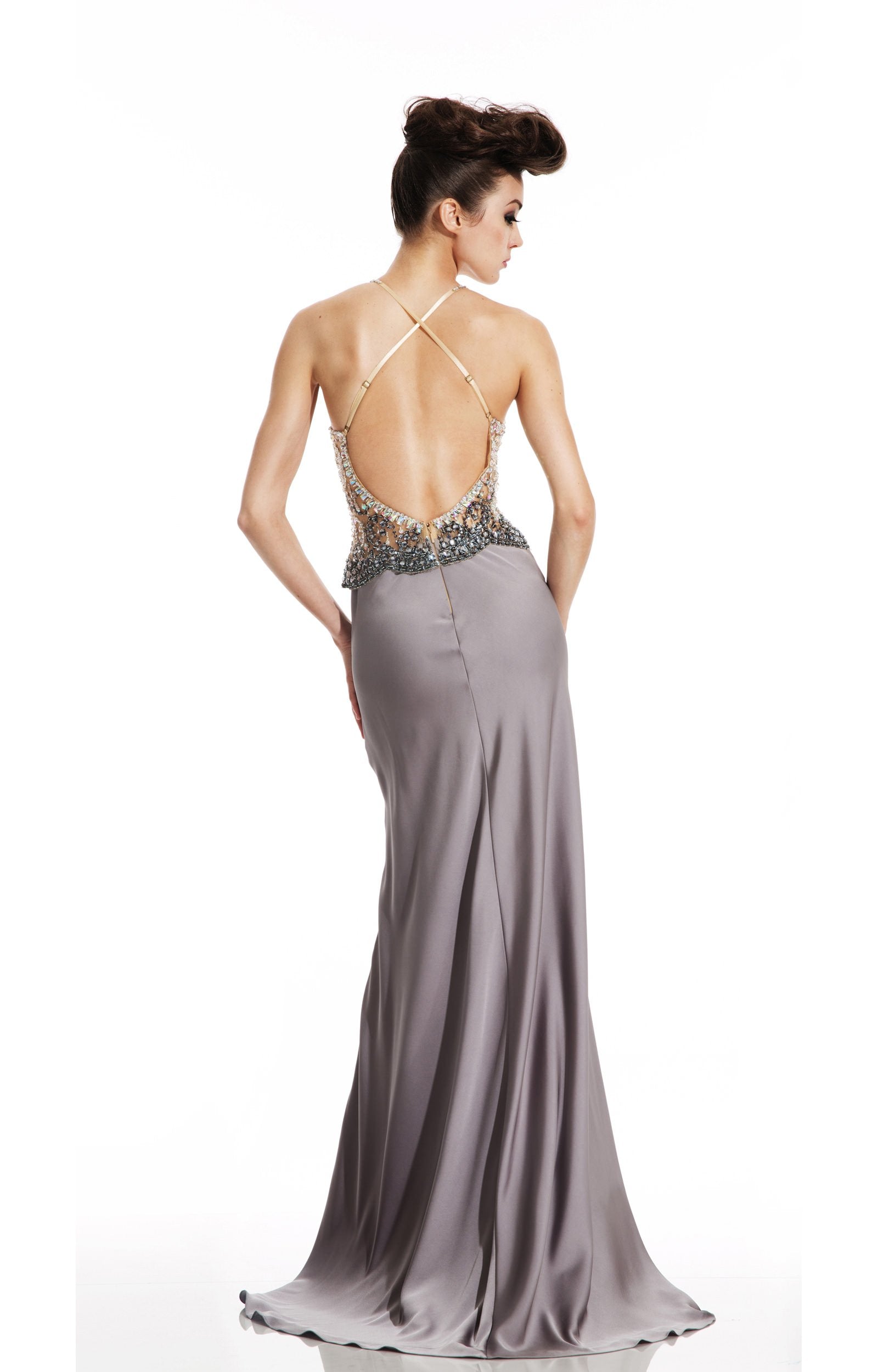 Johnathan Kayne 456 Size 6 Gunmetal Sheer V Neck Formal Evening Gown Satin Slit