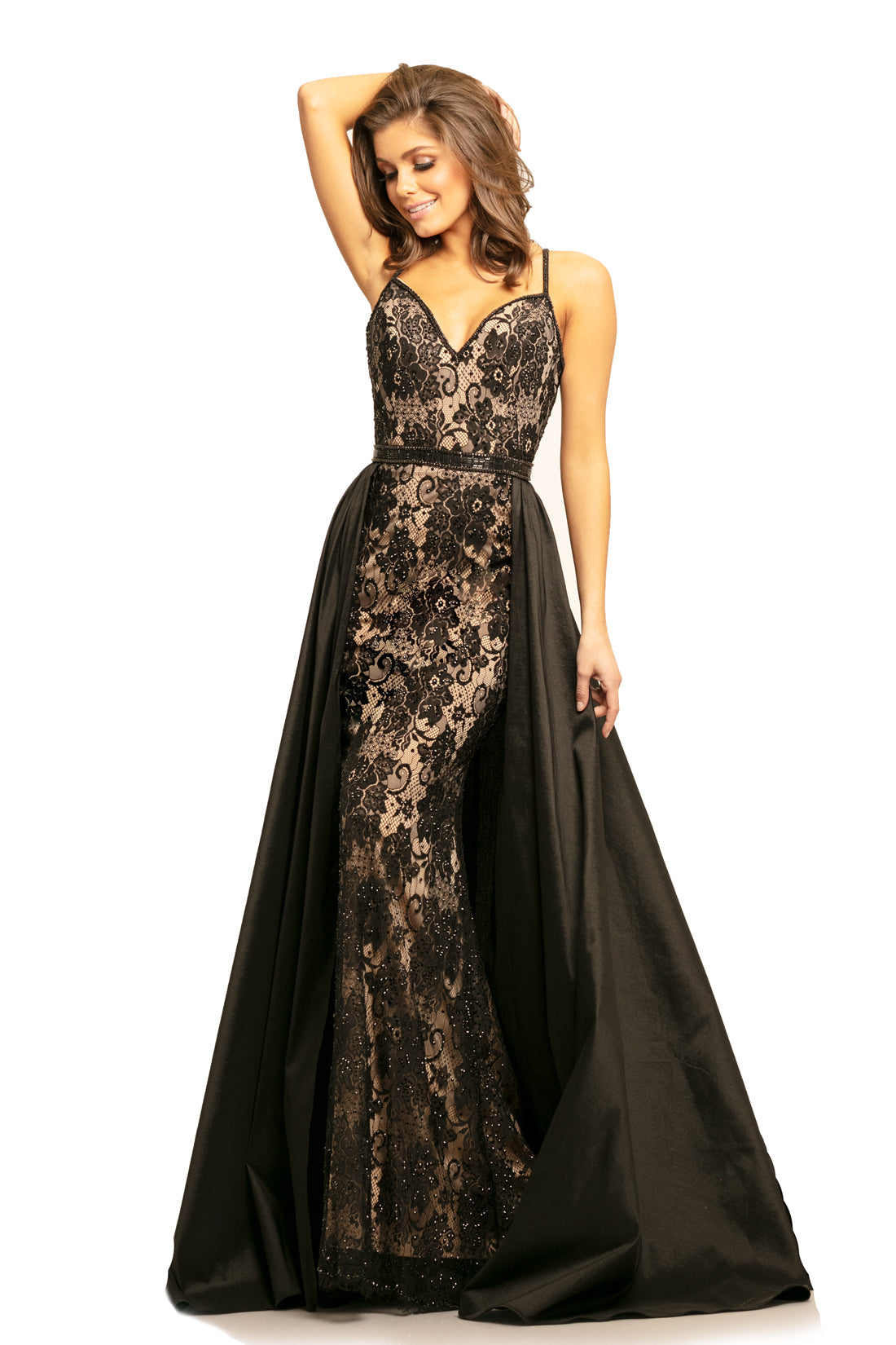 Johnathan Kayne 7242 is a lace Prom Dress, Pageant Gown & Formal Evening Wear. The structured bodice of this A/B crystal adorned stretch lace gown offers excellent, supportive construction. The column skirt falls over the hip and is framed by the dramatic taffeta hostess skirt that flows around the body.