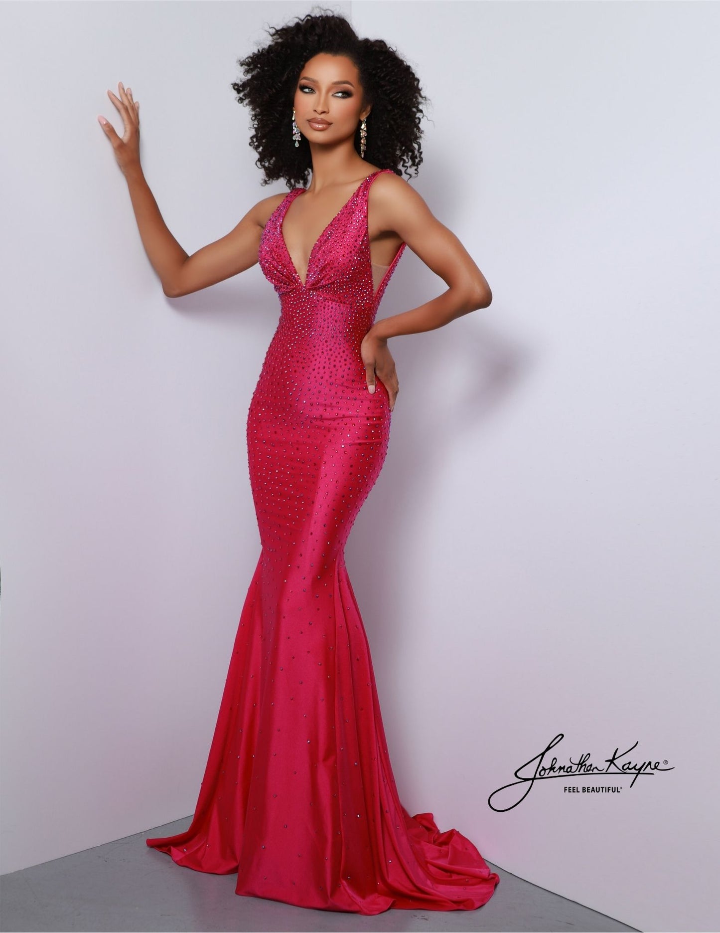 ,Johnathan Kayne Dress 9213 is an embellished stretch Prom Dress, Pageant Gown & Formal Evening Wear. One of Johnathan Kayne's favorite styles for the Fall season, this elegant 4 way stretch lycra gown has a modern empire bodice and hugs the body all the way to the dramatic train. Adorn in shimmering crystals, this gem of a gown will turn heads.