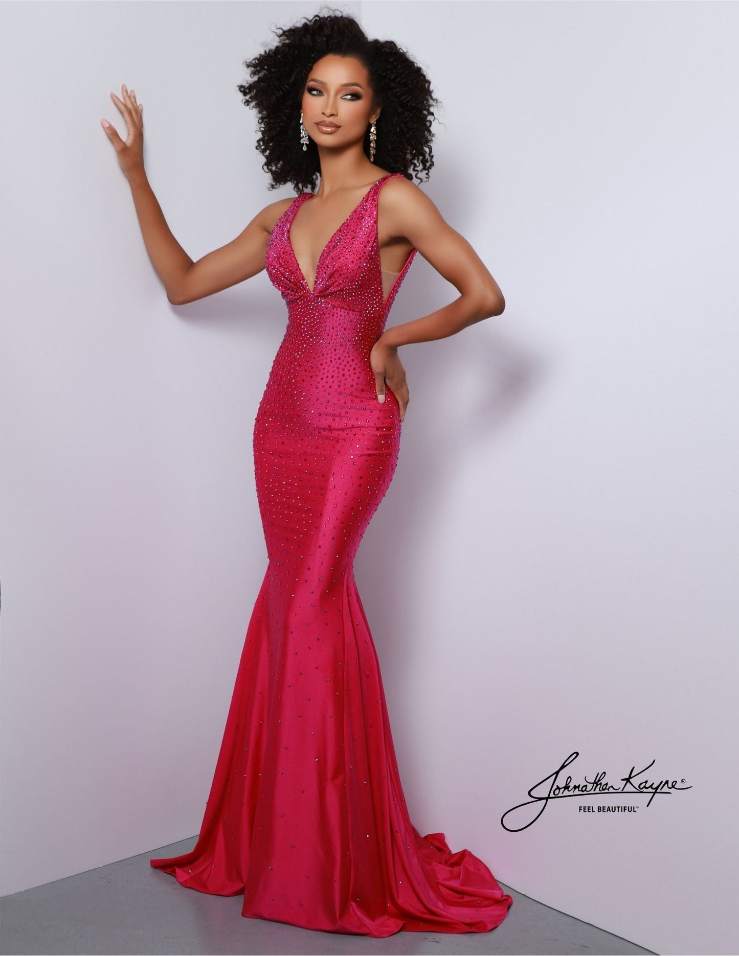 Johnathan Kayne 9213 is an embellished stretch Prom Dress, Pageant Gown & Formal Evening Wear. One of Johnathan Kayne's favorite styles for the Fall season, this elegant 4 way stretch lycra gown has a modern empire bodice and hugs the body all the way to the dramatic train. Adorn in shimmering crystals, this gem of a gown will turn heads.