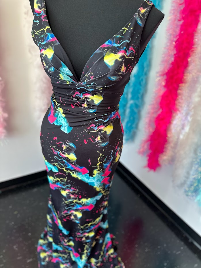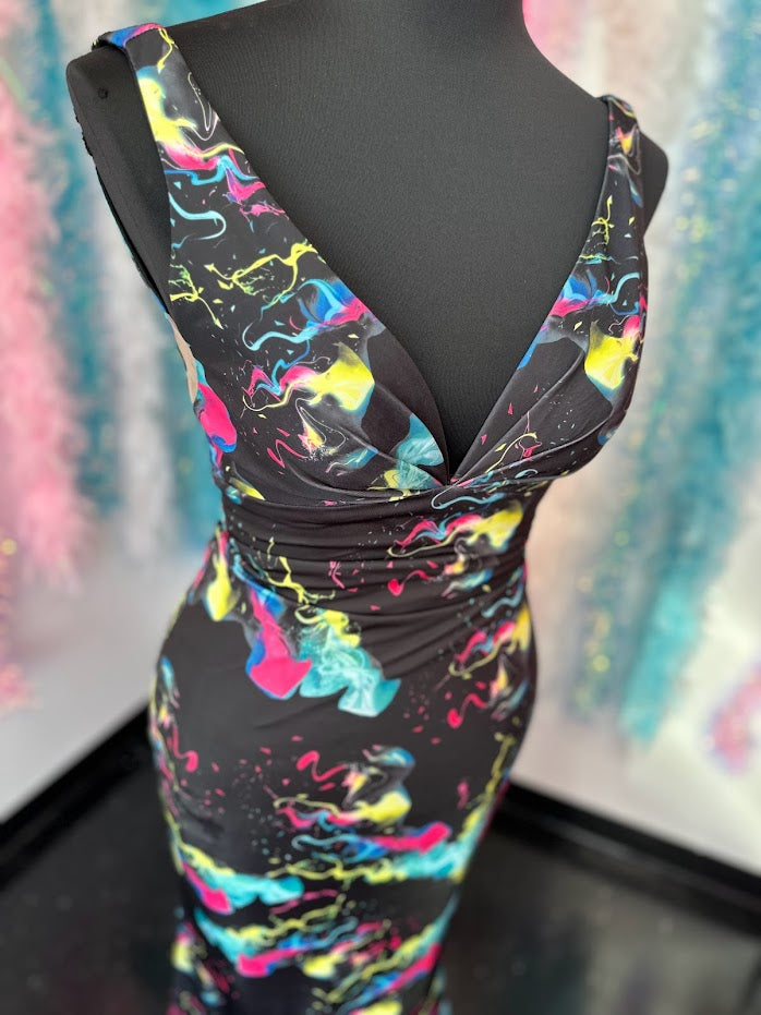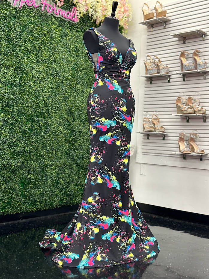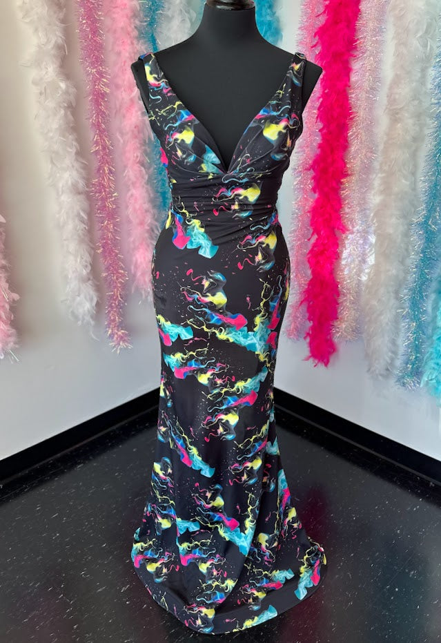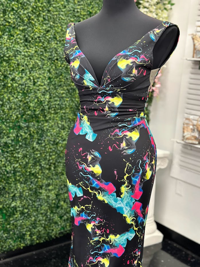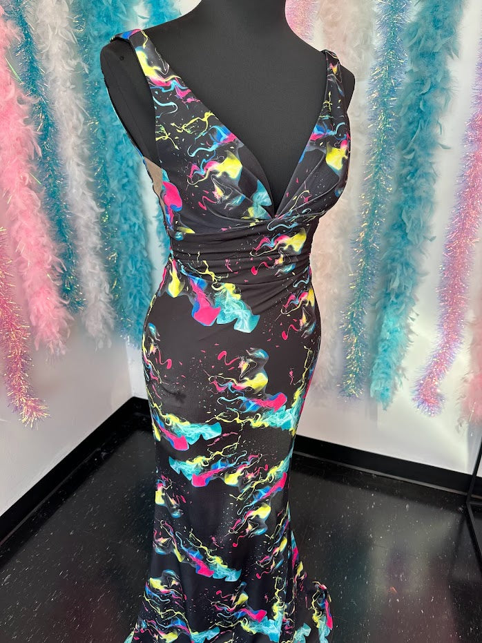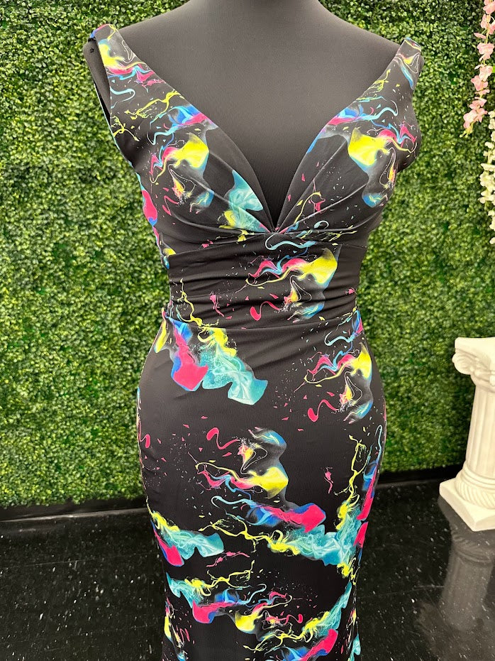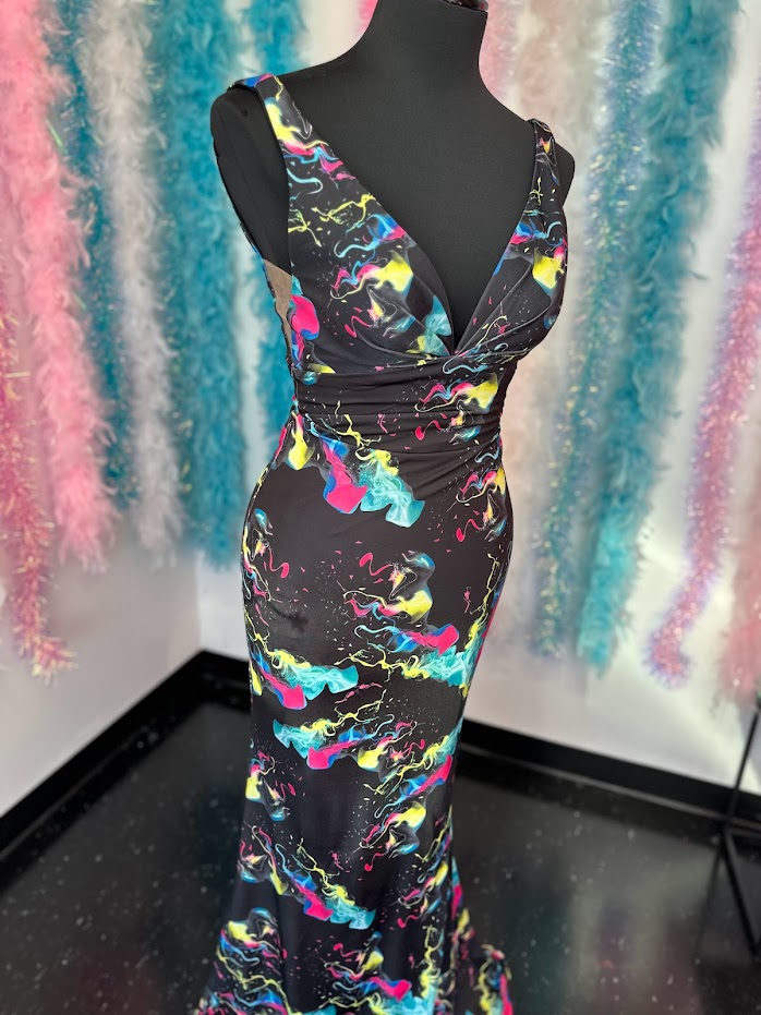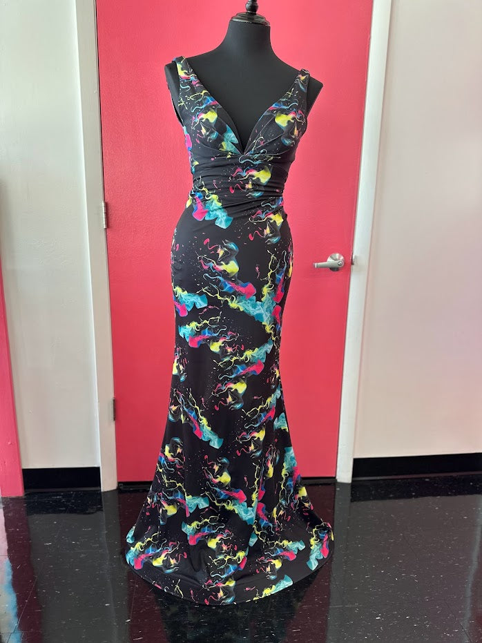 Johnathan Kayne 9213 Size 4 Smoke Bomb Fitted Neon Jersey Prom Dress Formal V Neck