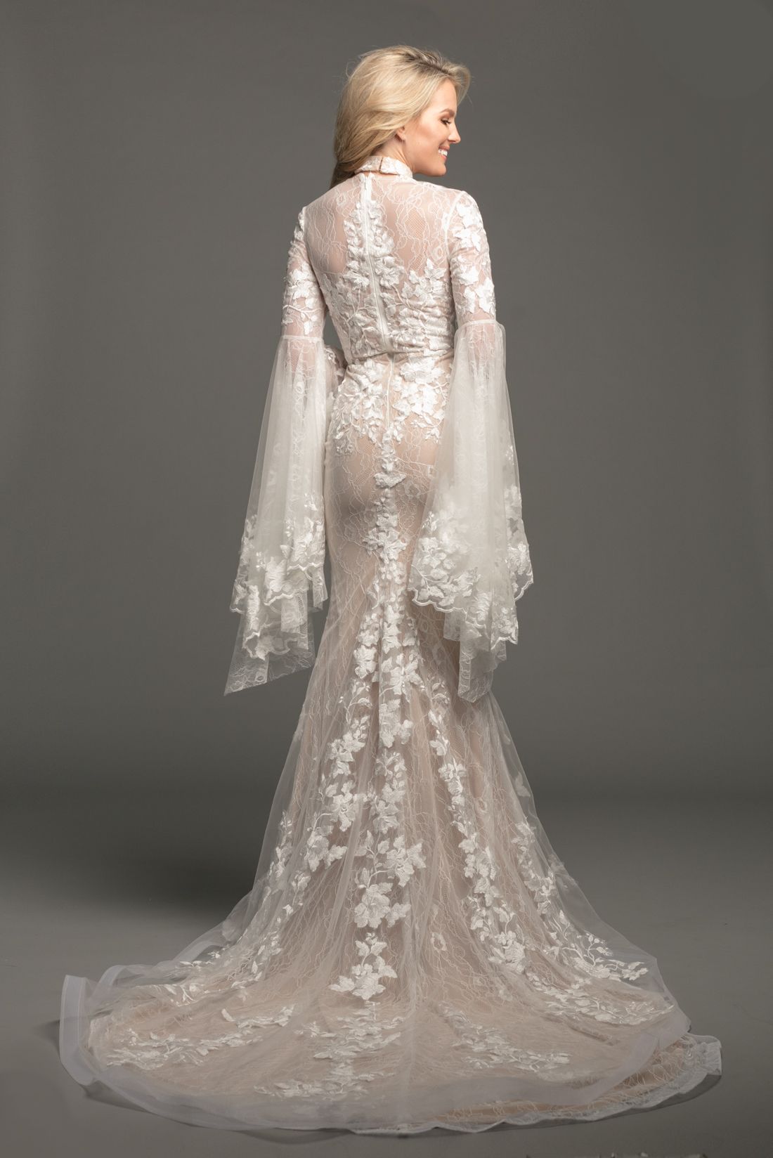 Johnathan Kayne Bridal B110 is a stunning fitted Ivory lace over nude wedding dress with Floral lace appliques. v neckline with choker. Lush long lace bell sleeves and a sweeping sheer lace train. sheer bodice & back.