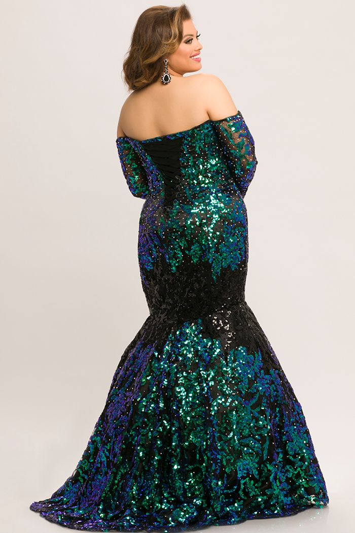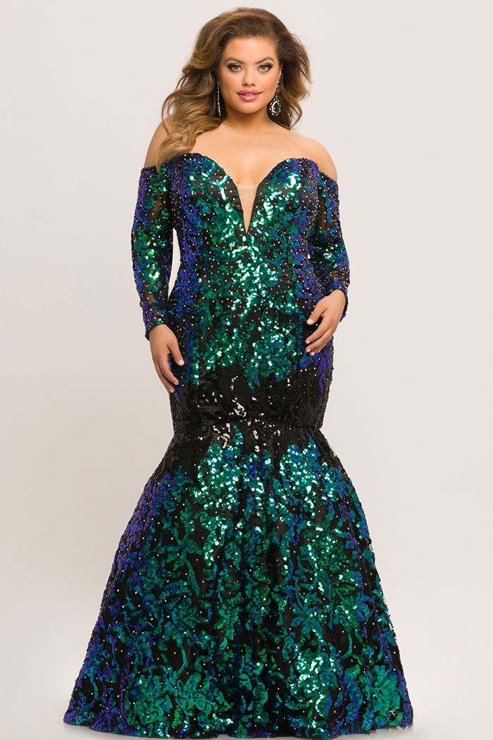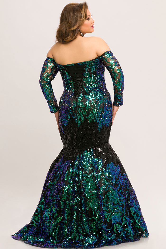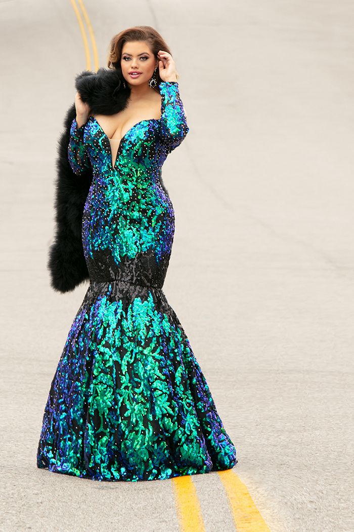 Johnathan Kayne for Sydneys Closet JK2010 Cobra off the shoulder long sleeves plunging neckline mermaid plus size prom dress with corset back embellished with stones. Long Sequin Mermaid Pageant Gown. Sexy Plunging Neckline with sheer embellished off the shoulder long sleeves. Stunning Multi Sequin pattern. Lace up corset back closure for a perfect & Accentuating fit! JK 2010