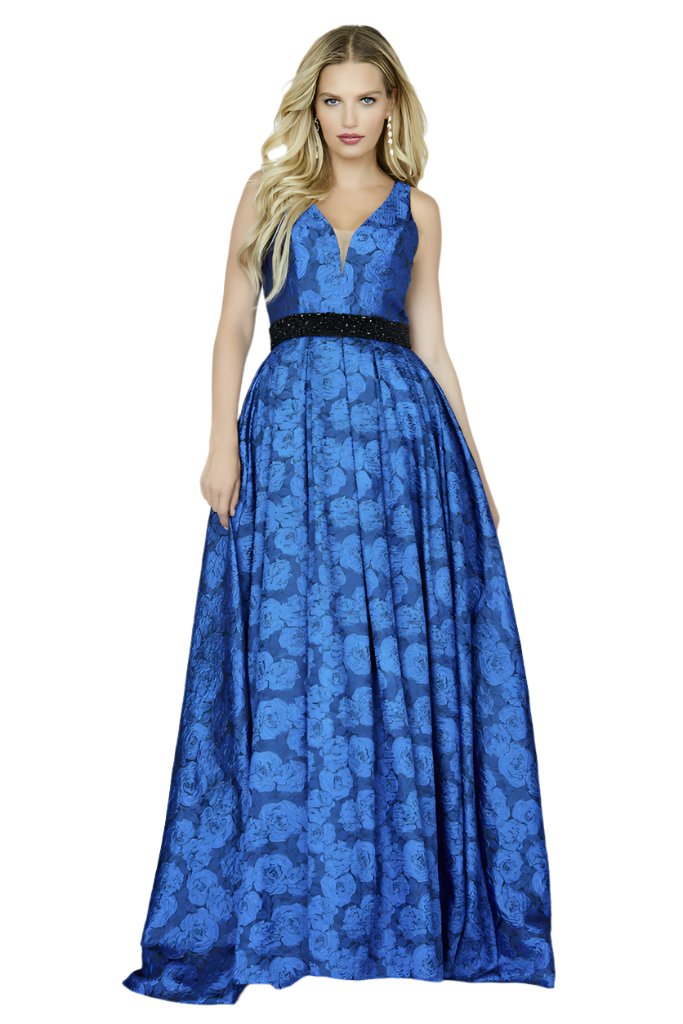 Jolene Collection 19061 Royal/Black Long Floral print Brocade formal evening gown. this prom dress features a keyhole cutout back. Black embellished & beaded waist belt. V neckline and A Line skirt has Pockets!
