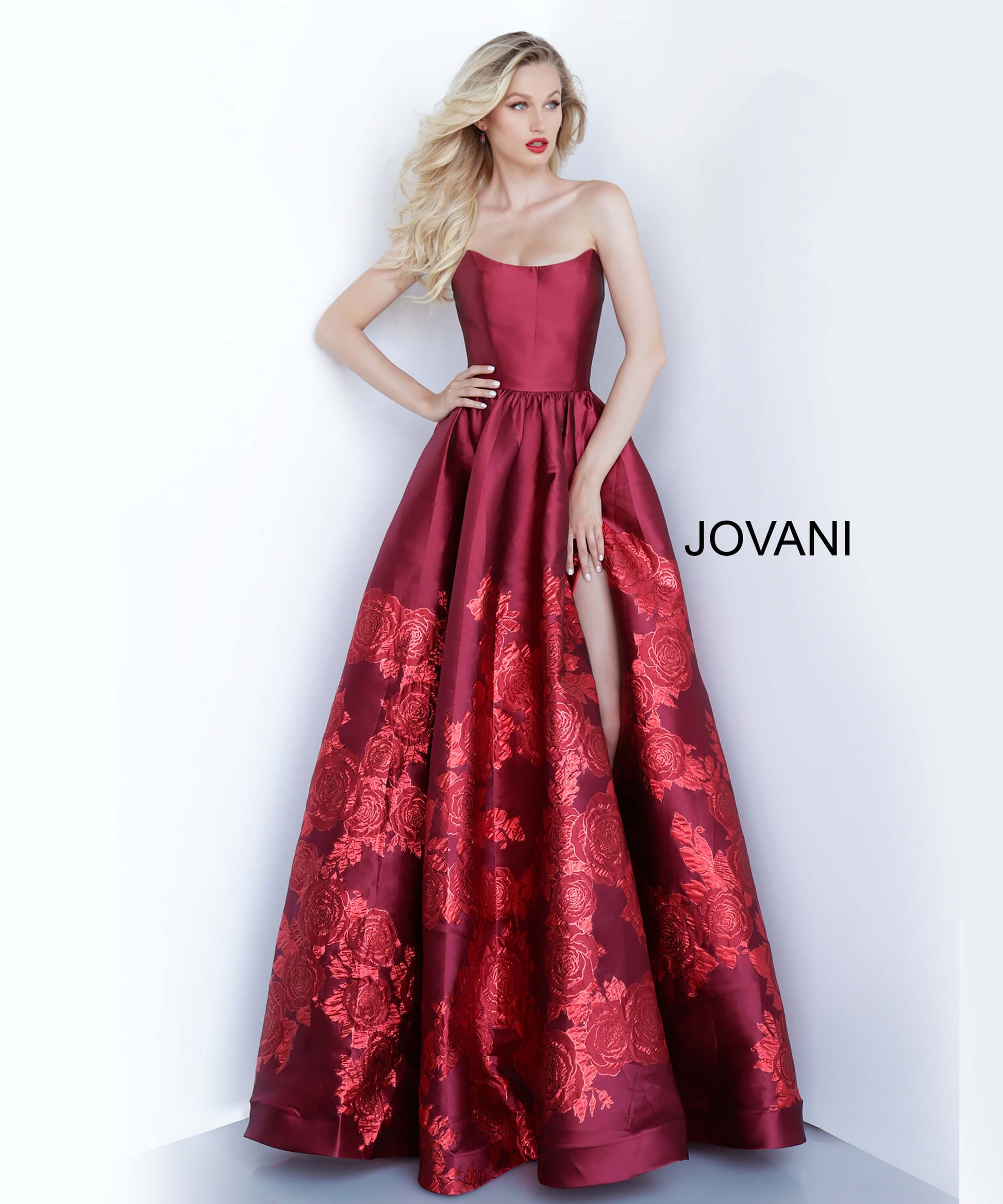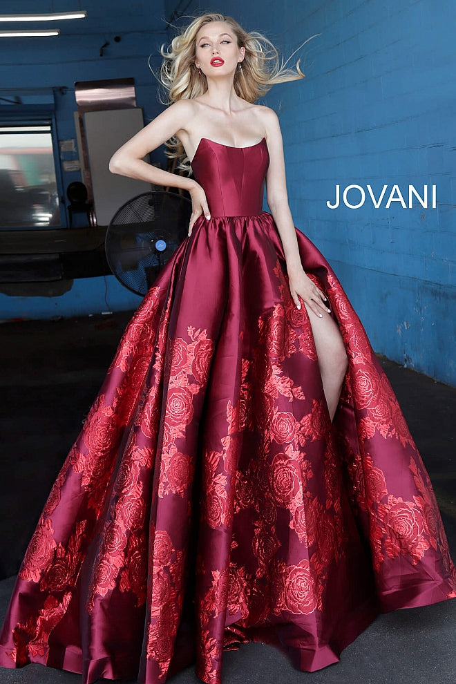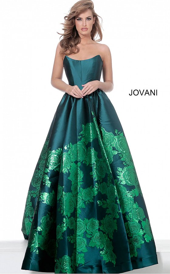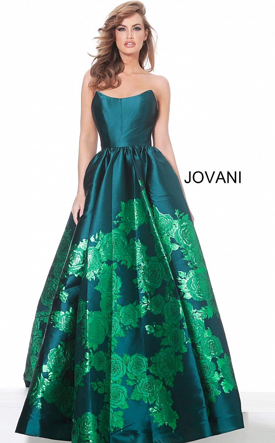 Jovani 02038 Floral Ballgown Long Print Prom Dress Slit Strapless Designer V Points Neckline