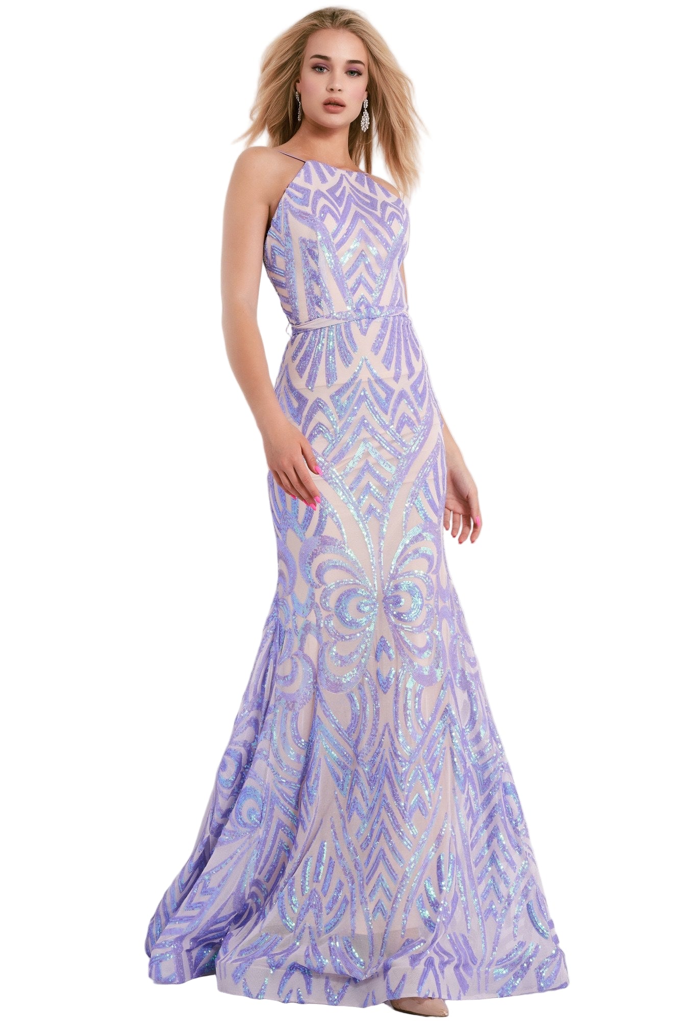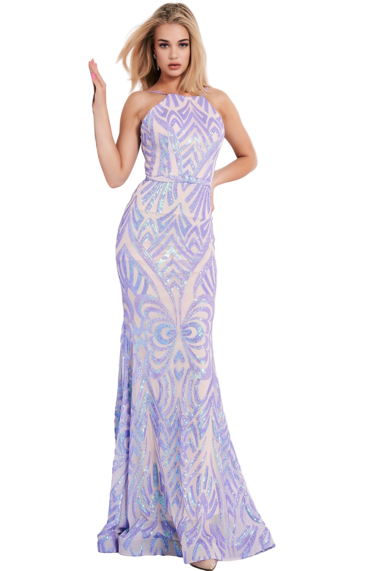 Jovani 03446 size 12 Lilac Backless Sequin Prom Dress Fit and Flare High neck Gown