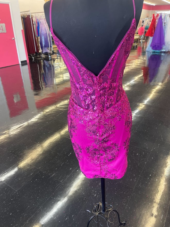 Jovani 04699 Size 4 Berry Short Fitted Sheer Glitter Homecoming Formal Dress V Neck Cocktail Dress