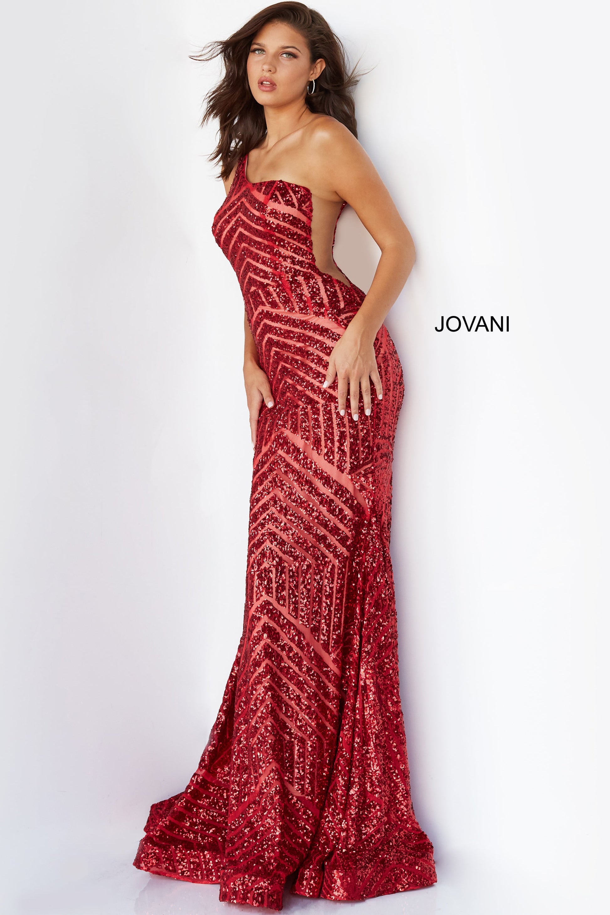 Jovani 06017 Purple Long Mermaid Prom Dress. This Jovani 06017 prom gown features a fit and flare silhouette in geometric sequins, detailed with a one-shoulder neckline and sheer plunging sides. Soft godets add volume to this glitter formal dress, finished with a horsehair hem and lush sweeping train.