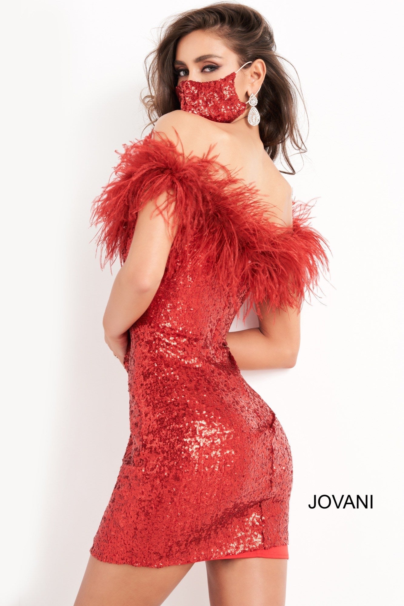 Jovani 06167 is a short fitted sequin cocktail evening dress. Featuring a straight neckline with off the shoulder feather embellished straps. Fitted Stretch Sequin bodice is perfect for any formal event or occasion! Sexy wedding reception dress in Ivory or Little black dress.