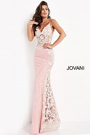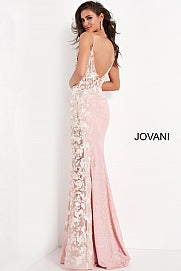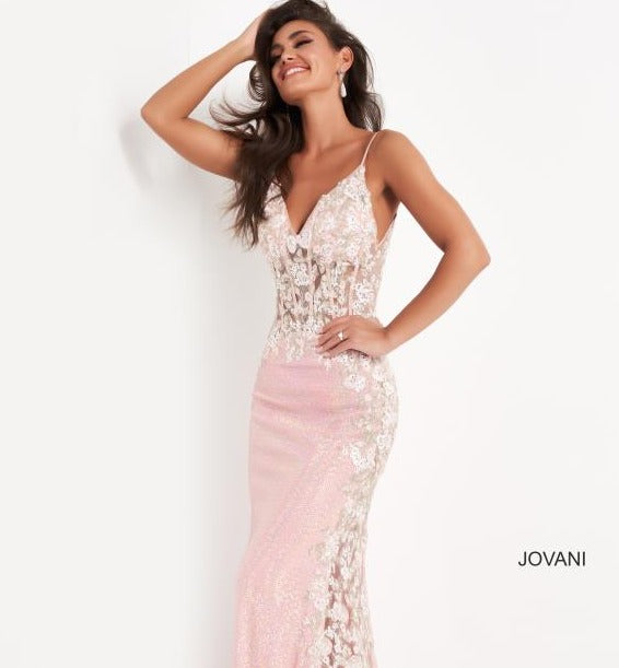 Jovani 06232 is a long fitted pink sequin Formal evening gown. Featuring a Gorgeous Sheer Corset Style fitted bodice with boning. V neckline. This Prom dress is accented with floral appliques embellished & Cascading from the bodice down into the sheer side panel that runs the length of this pageant gown. Backless. Sequin embellished skirt. Great sexy gown for any formal event!