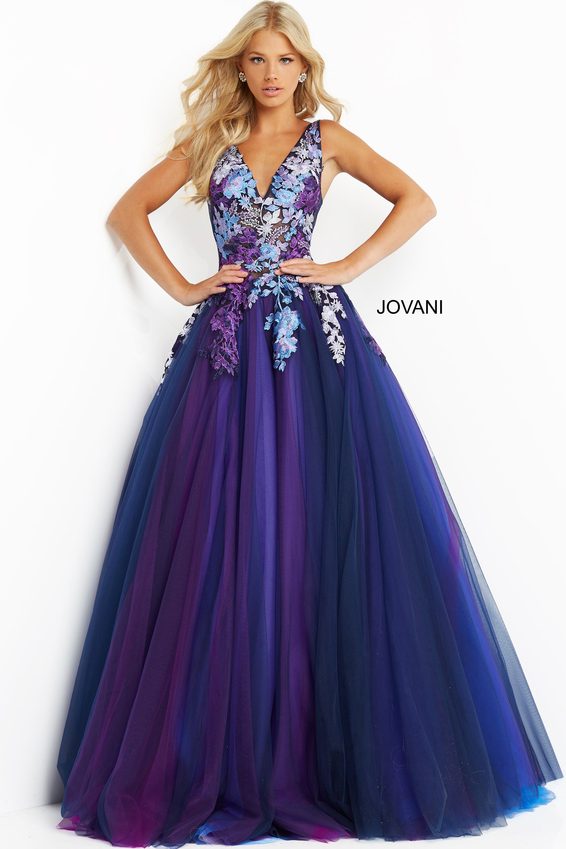 Jovani 06807 Navy Multi Long Prom Dress Ballgown Embroidered Flowers Tulle Skirt