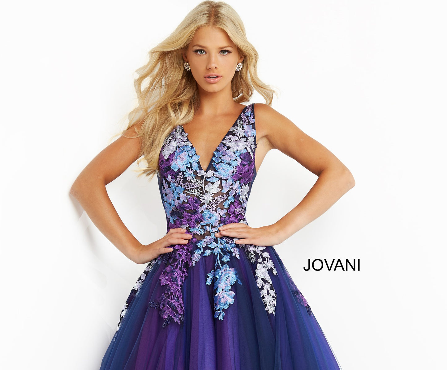 Jovani 06807 Navy Multi Long Ballgown Prom Dress. Floor length navy multi Jovani prom ballgown 06807 features floral embroidered sleeveless bodice with plunging V neck and open back.