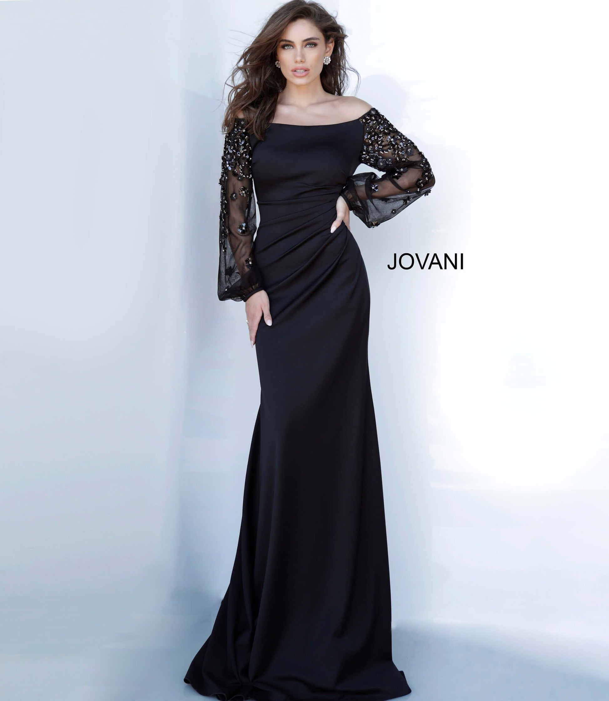 Jovani 1156 off the shoulder long sleeve evening dress black sheer sleeves
