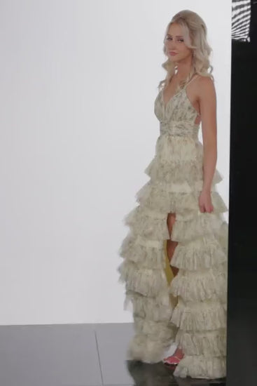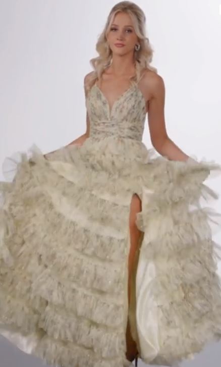 Jovani 36571 Long Prom Dress A-Line Layered Ruffle Skirt V Neckline Formal Pageant Gown