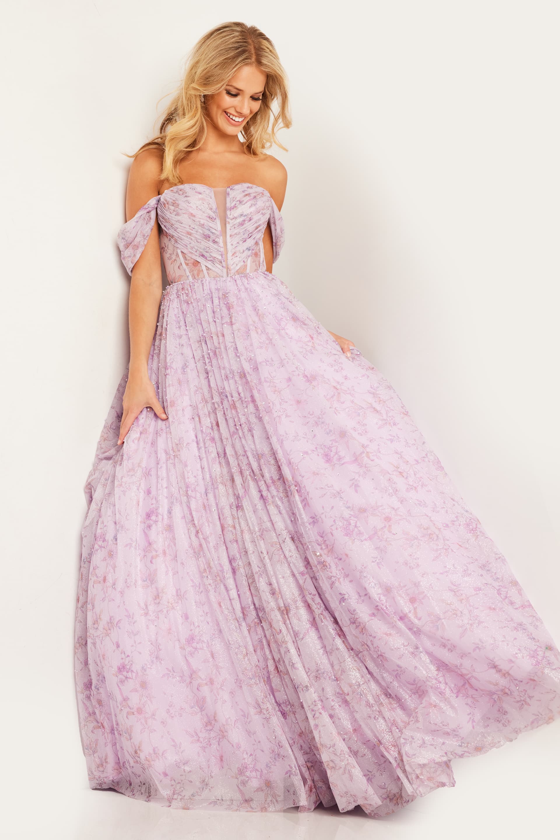 Jovani 36581 floral print prom dress A line off the shoulder sweetheart neckline with corset bodice