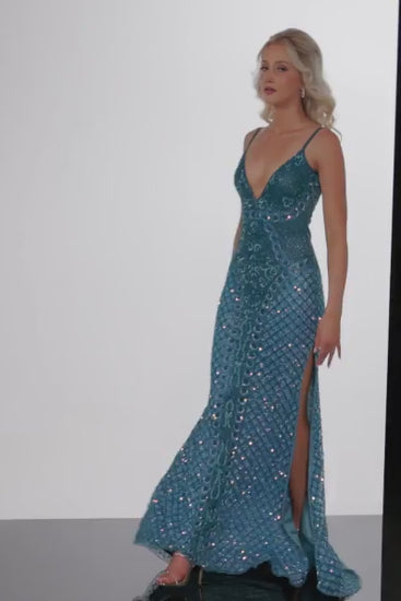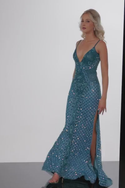 This exquisite gown from Jovani 36643 is a show-stopping choice for proms, formal events, and pageants. It's designed to make a statement and leave a lasting impression. Crafted from luxurious beaded mesh, the dress exudes opulence and sophistication. The intricate beadwork adds a touch of glamour, ensuring you sparkle and shine under the lights. The dress features a form-fitting silhouette that's designed to accentuate your figure, making you look and feel your absolute best on your special occasion. One of the standout details of this gown is the high side slit, which adds an alluring touch to your look. It allows you to showcase your legs and move with grace and confidence.