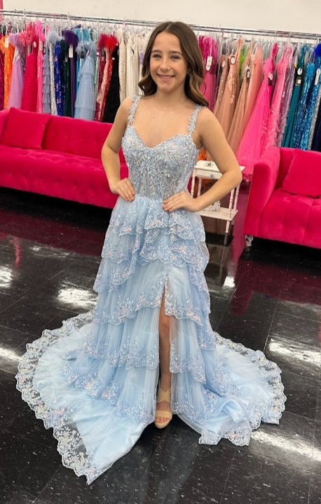 Jovani 36687 Size 6 LILAC Long Prom Dress Sequin Floral Corset Off Shoulder Layered Skirt Slit Train formal Pageant Gown